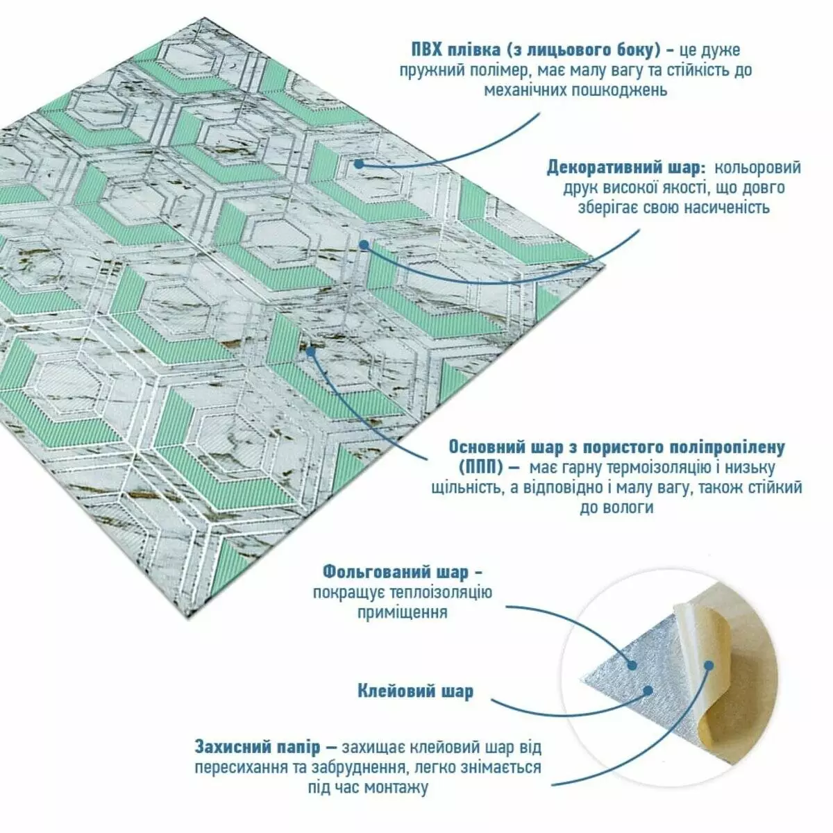 3. Легкість монтажу: наявність клейового шару дозволяє встановити панелі без необхідності застосування додаткових матеріалів.