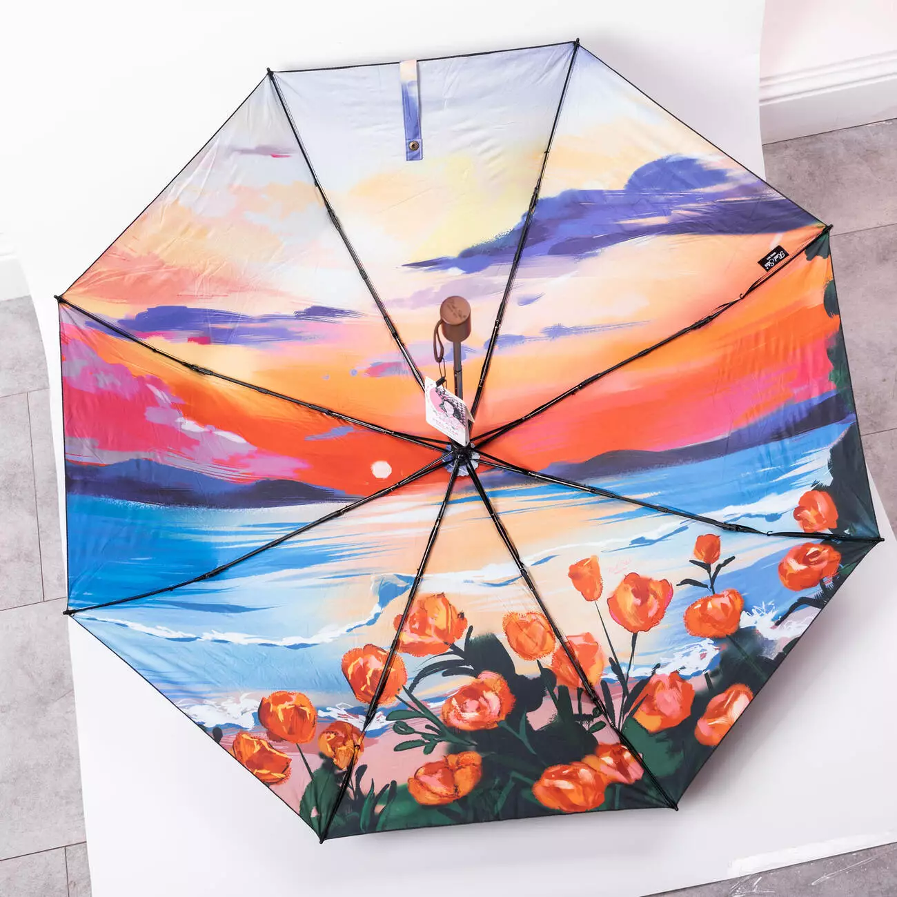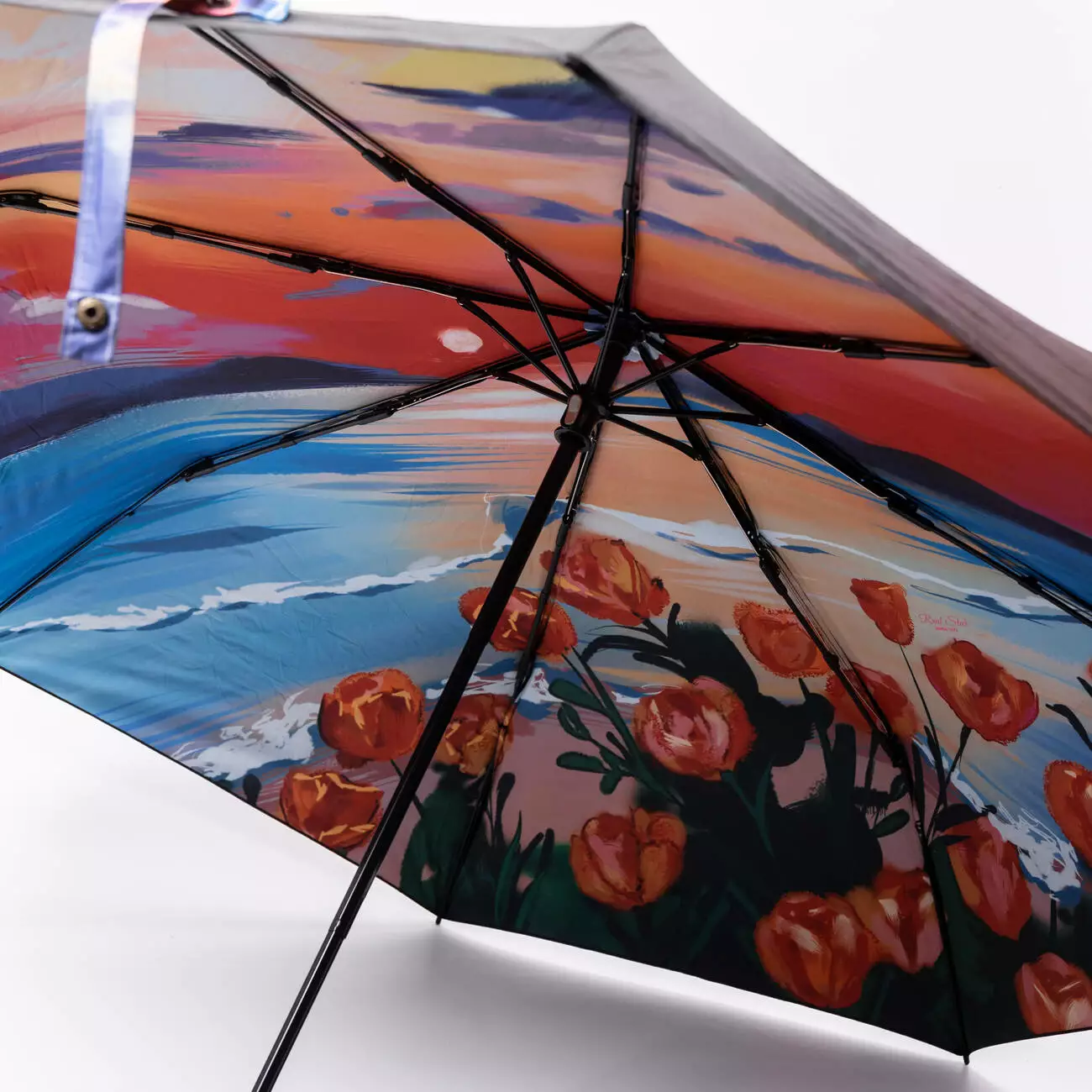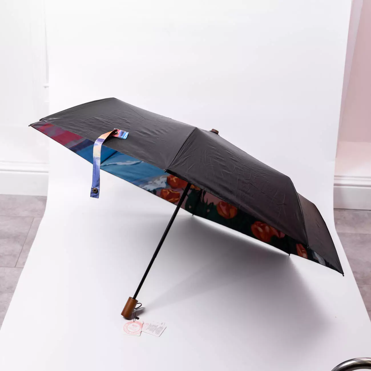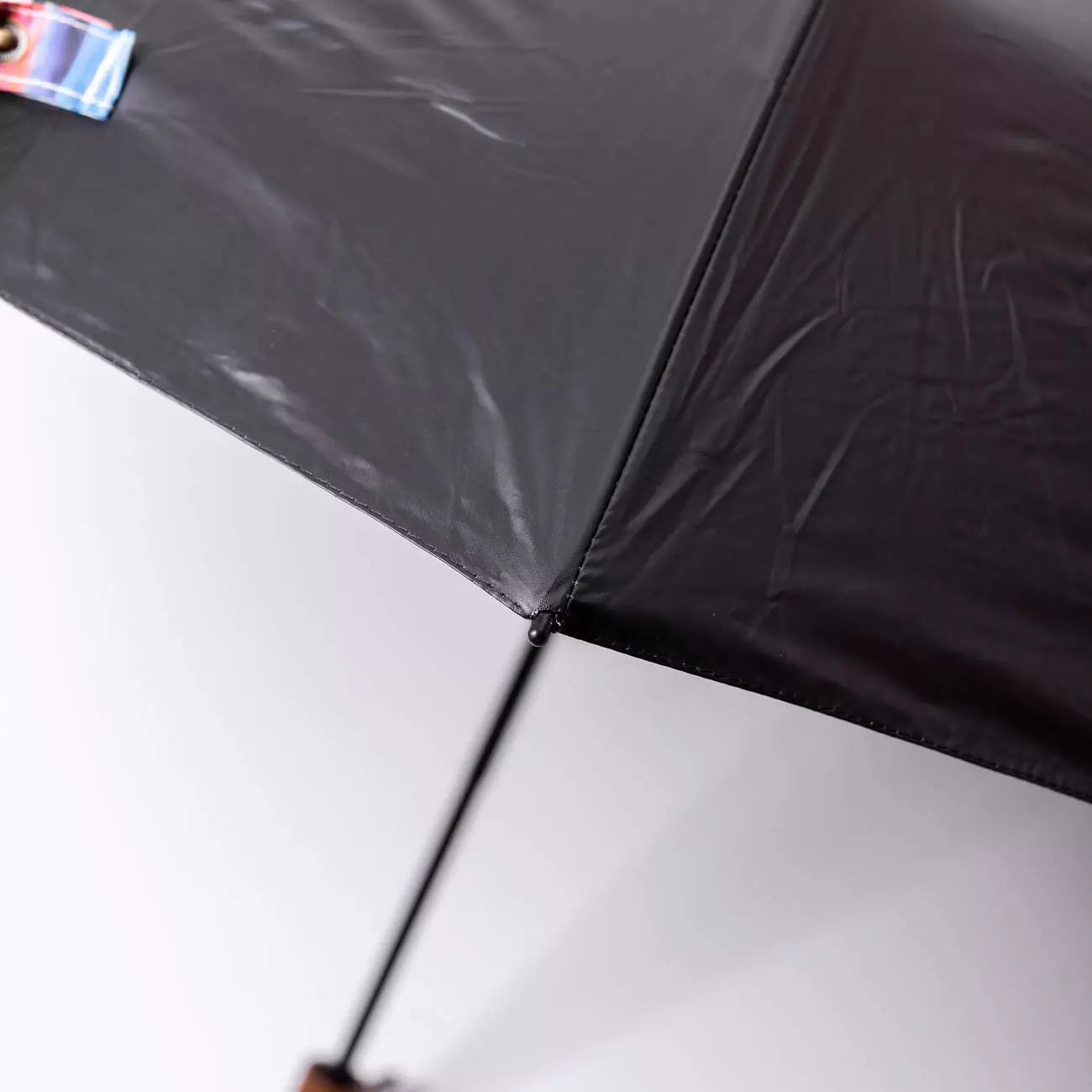 Складна механічна парасоля поєднує практичність і стильний дизайн. Вона має класичну конструкцію з металевою основою та спицями, що забезпечує стійкість і довговічність. Купол виконаний із поліестеру, який добре захищає від дощу та швидко висихає після використання. Зовнішня сторона купола чорна, що робить парасолю універсальною, а внутрішня прикрашена яскравим принтом, додаючи їй оригінальності.