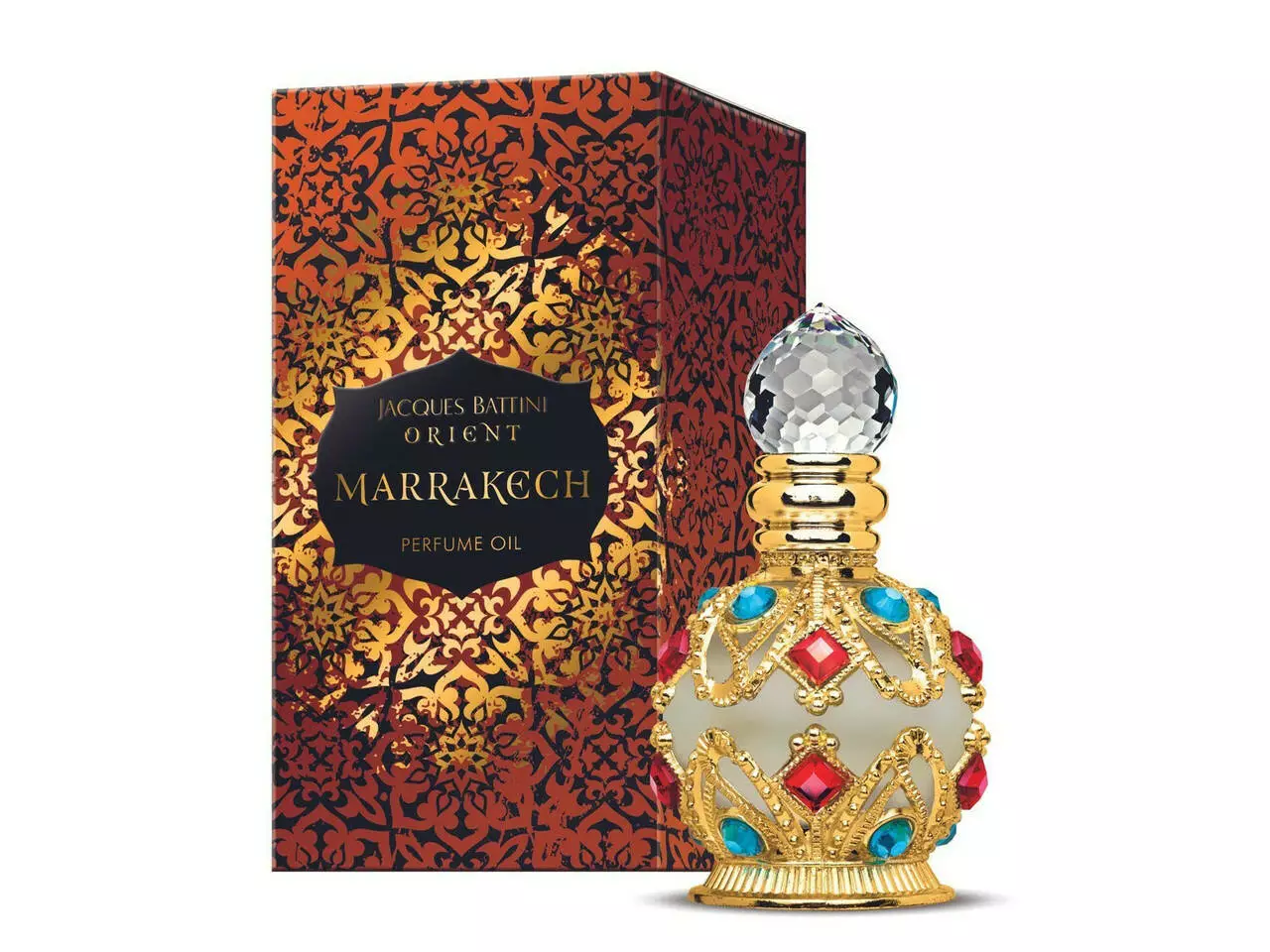 Парфумована олія Marrakech. Маленька ювелірна пляшечка, що нагадує дорогоцінну східну прикрасу, є не що інше, як флакон з марракешською олією. Чудово прикрашена різнокольоровими, красиво відблискуючими каменями в золотих прикрасах, пляшка стане ідеальною прикрасою туалетного столика кожної жінки. Усередині нього прихований сміливий вечірній аромат. Класика з інтригуючим відтінком Сходу. Довготривалий аромат повільно розкриває наступні ноти аромату, від солодких пряно-фруктових до легких квіткових, підсолоджених ваніллю. Флакон оснащений піпеткою, яка полегшує дозування потрібної кількості масла на шкіру.