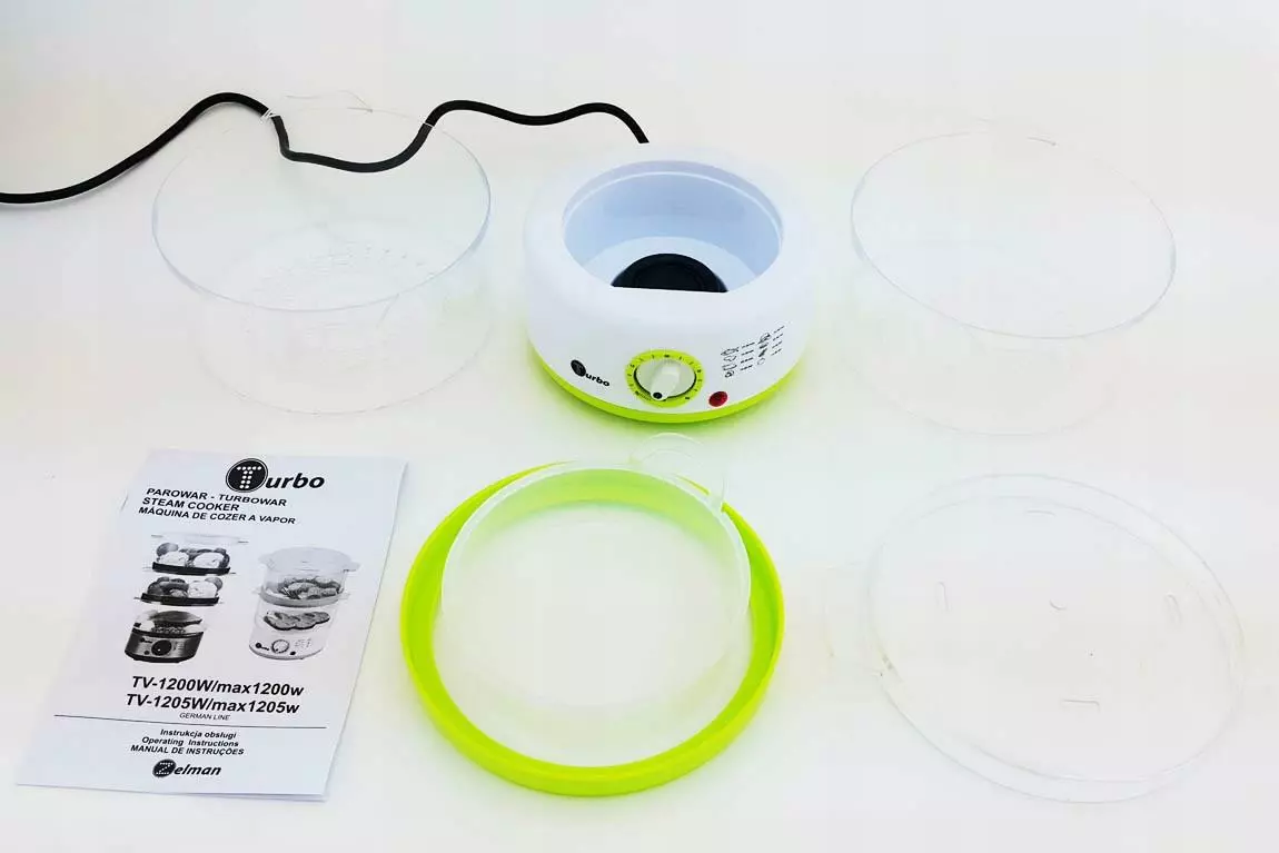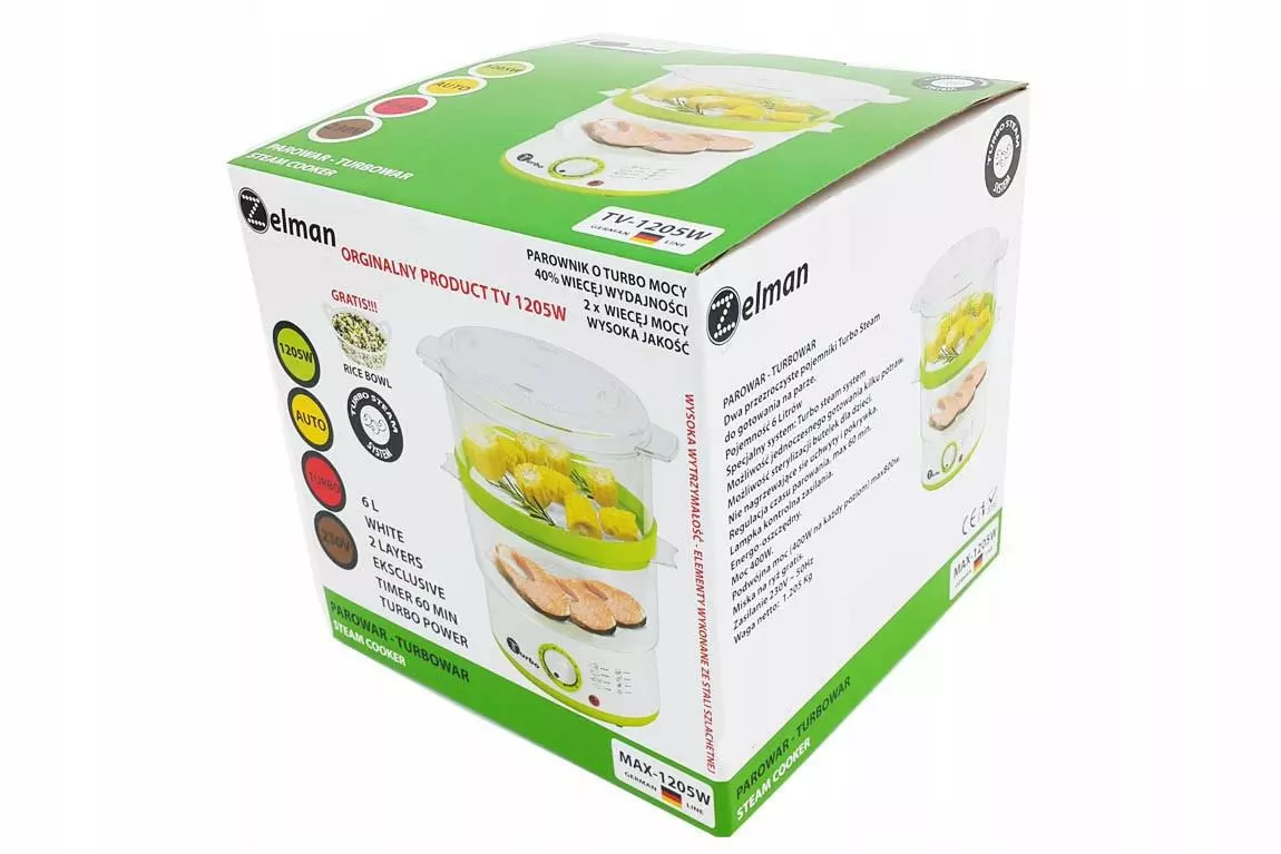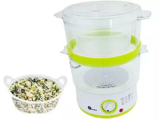 Удобная пароварка мошностью 400w, max-1205w, с двумя уровнями + контейнер для риса Специальная система турбо пара для увеличения количества пара, идеально подходит для здорового питания, (рекомендовано врачами) Два контейнера из специального прочного пластика . Оригинальная упаковка с инструкцией на руском языке, повышенная долговечность - легко и просто в использовании . В отличие от вареных блюд из пароварки, они сохраняют большую часть своих витаминов и микроэлементов, что делает их более ценными. Большая вместимость позволяет готовить одновременно множество блюд в различных комбинациях. Встроенный таймер, отсчитывающий время приготовления ето позволяет готовить блюда в комфортных условиях. Простая конструкция пароварки упрощает его использование и очистку. Еду приготовленную на пару рекомендуют диетологи и особенно полезена людям с проблемами пищеварительного тракта и тем, кто хочет похудеть. - прочный корпус - емкость 6 литров - два уровня - удобство хранения (возможность складывать одну емкость в другую) - контрольная лампа - мощность в 3 раза больше, номинальная мощность 400 вт, макс. 1200 вт - очень легко мыть и чистить - самые важные детали можно мыть в посудомоечной машине - прочный корпус - аппарат новый, в оригинальной упаковке - вес изделия 1,4 кг