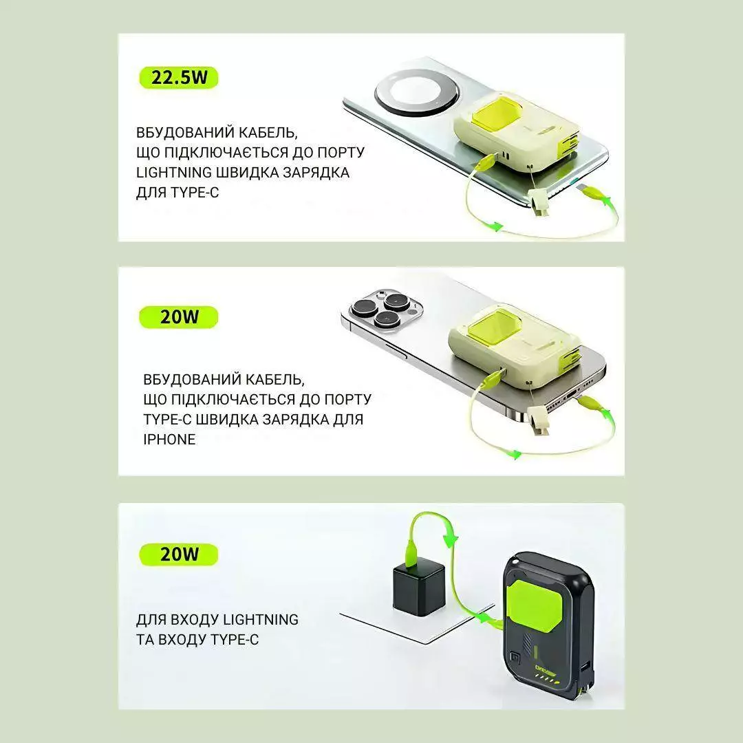 У комплект входить універсальний кабель Type-C/Lightning. Міцний
