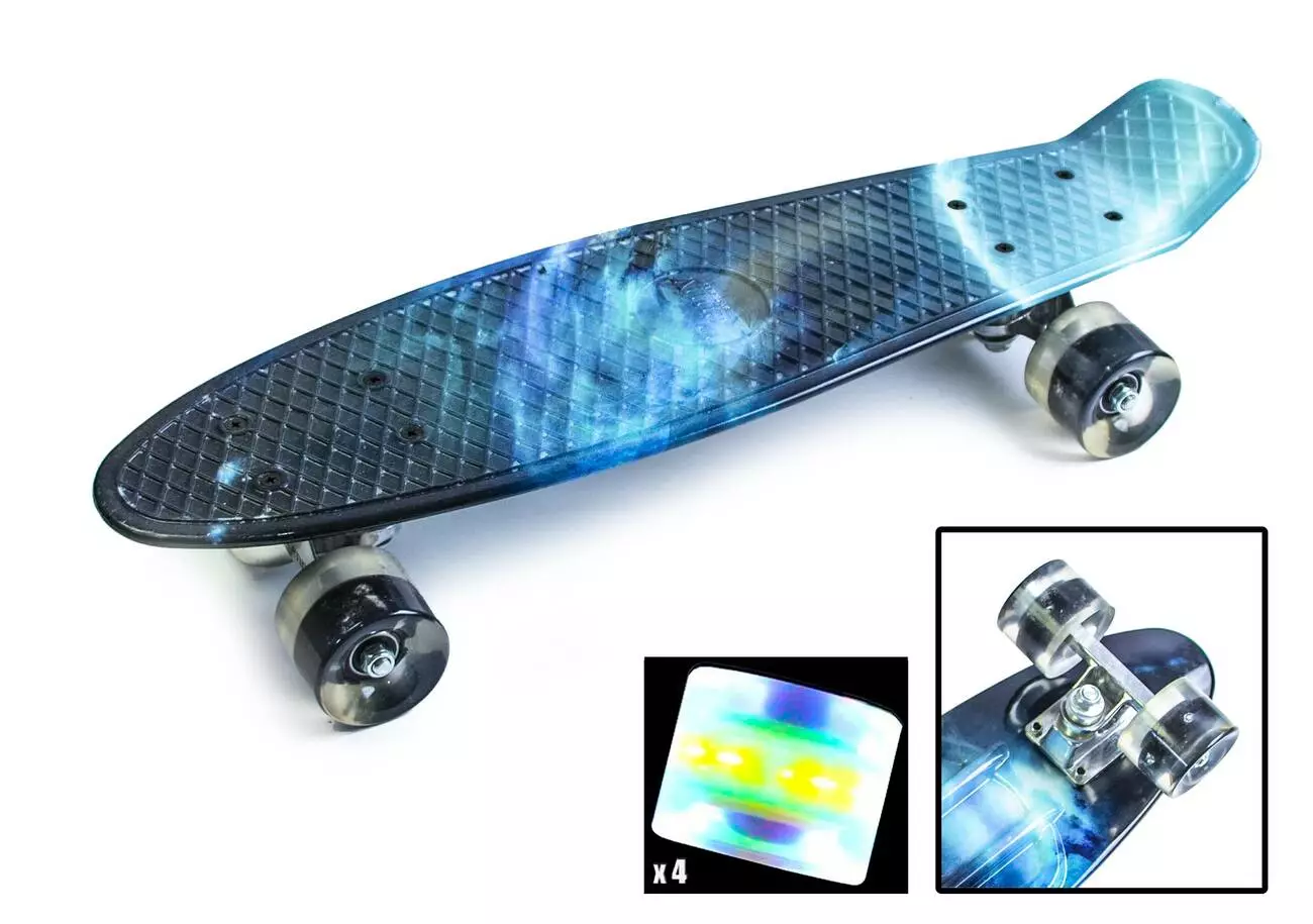 <p>Модный Penny Board "Galaxy" с темно-синими светящимися колесами - прекрасный выбор для стильной молодежи, которая ищет оригинальную расцветку.</p><br /> <p>Описание:</p><br /> <p>-изделие торговой марки "Penny Board";</p><br /> <p>-высокопрочный карбон-пласт в основе деки: легкость и долговечность;</p><br /> <p>-компактный и вместительный размер доски: 57 х 15 см, толщина 11 мм;</p><br /> <p>-узорный рисунок с антискользящим эффектом;</p><br /> <p>- логотип Penny на деке.</p><br /> <p>-прочная крашенная металлическая подвеска;</p><br /> <p>-высококачественные подшипники ABEC-9;</p><br /> <p>- светящиеся колеса из полиуретана (PU) -бесшумность и маневренность;</p><br /> <p>-уровень жесткости колес – 84А;</p><br /> <p>-предел нагрузки - 75 кг;</p><br />