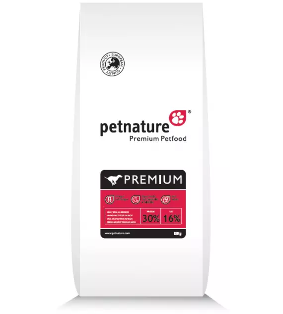 Сухий корм PetNature для собак всіх порід - PREMIUM DOG Склад: зернові (рис, мін. 10%), м'ясо та тваринні побічні продукти (курка, мін. 20%), екстракти рослинних білків, риба та рибні похідні, риб’ячий жир (багатий Омега 3, мін. 2%), овочі , мінеральні речовини, натуральний ароматизатор–печінка птиці, яйця, екстракт Юкки Шидігера, глюкозамін гідрохлорид, хондроїтин сульфат, фолієва кислота, L-лізин, маннано-лігосахариди, фрукто-олігосахариди, природні антиоксиданти. Аналітичний склад: Сирий білок 30%, Сирий жир 16%, Сира клітковина 2,5%, Сира зола 6,7%, Вологість 10%, Кальцій 1,2%, Фосфор 0,9%. Харчові добавки (на 1 кг): Вітаміни та мінерали: Вітамін А 20.000 МО, Вітамін Д3 2.000 МО, Вітамін Е (альфа-токоферол) 120 мг, Заліза сульфат моногідрат 165 мг, Кальцію йодад ангідрит 0,23 мг, Мідного купоросу пентагідрат 9 мг, Марганцю оксид + Марганцю хелат 4,5 мг, Цинку хелат 115 мг, Натрію селеніт 0, 18 мг. Рекомендована добова норма: Згодовується тваринам з урахуванням віку, маси тіла та рівня активності.