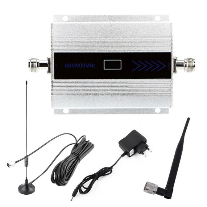 Підсилювач сигналу стільникового зв'язку 900 MHz (для 2G) включає репітер, антену, з'єднувальний провід і блок живлення (як на картинці). Прилад працює на частоті 900 МГц, здатний посилити сигнал до 70 дБ. Пристрій підтримує лише мережу другого покоління. Застосовується на об'єктах, до яких погано доходить сигнал з вишок, може використовуватися як у житлових, так і виробничих приміщеннях. Живиться підсилювач від побутової мережі 220В, до якої підключається через спеціальний адаптер. Прилад відрізняється простим налаштуванням, не вимагає спеціальних знань та навичок для встановлення. З нею можна впоратися самостійно в короткий термін – достатньо дотримуватися рекомендацій виробника, які вказані в інструкції.