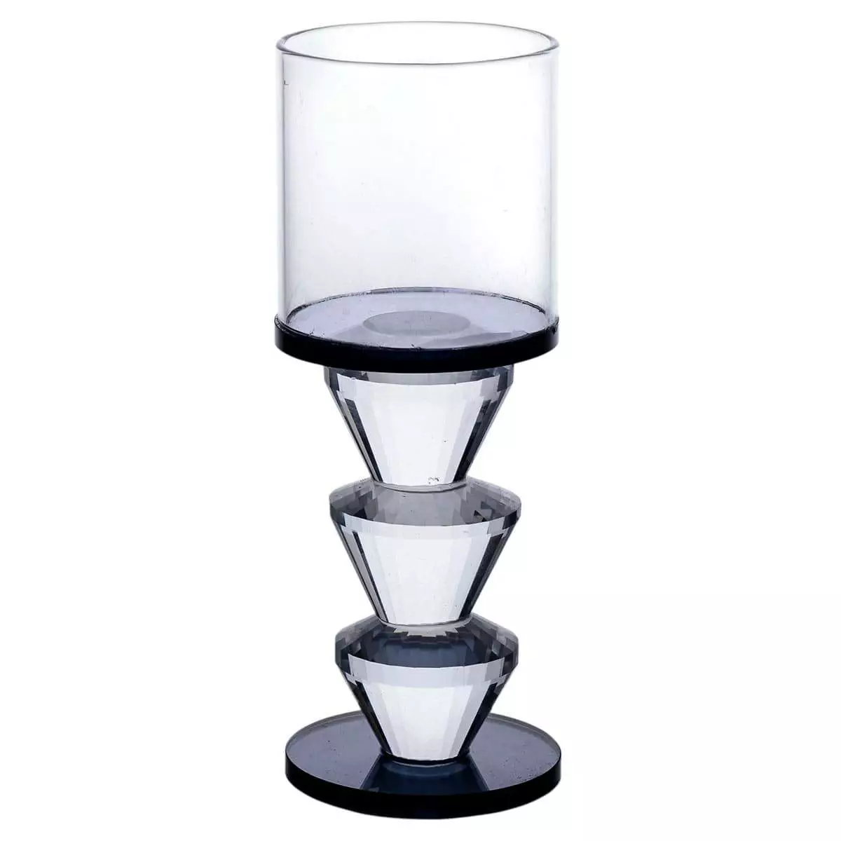 Підсвічник декоративний Parallels виготовлений зі скла та має сучасний геометричний дизайн. Завдяки прозорим стінкам і темним акцентам конструкція виглядає лаконічно та стримано. Пряма форма верхньої частини і кругла основа, доповнена конічним елементом, створюють візуальний баланс і додають стабільності виробу.