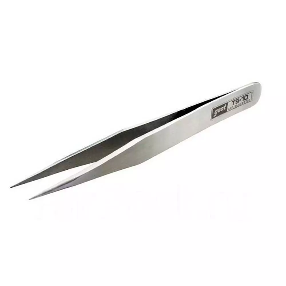 TS-10 антимагнітний - радіомонтувальний прямий посилений пінцет з гострими кінчиками. Губки пінцета без насічок. Виконаний з нержавіючої сталі, антимагнітний, стійкий до кислоти.