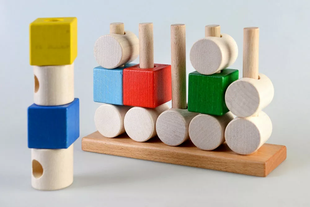 Яркая деревянная пирамидка «Кубики и цилиндры» является прекрасным