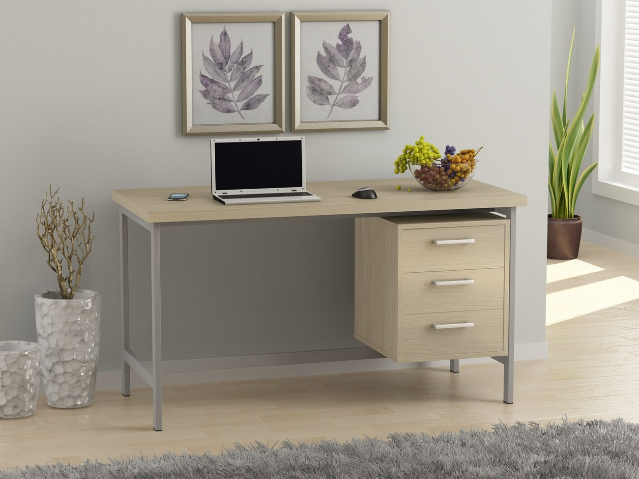 Металлическая конструкция произведена из прочной металлической трубы профилем 40*20 мм. Толщина металла 1,4 мм. Конструкция невероятно прочная и, следовательно, долговечная. Каркас письменного стола L-45 покрашен серебристой краской под хром. Для большей устойчивости письменного стола, в дополнение к прямоугольным ножкам используется еще три балки устойчивости: две под столешницей и одна под тумбой. Таким образом, столешница опирается на ножки и две балки, а тумба стоит на балке и крепится вверху к двум другим балкам сверху. Тумбу можно устанавливать как справа так и слева.