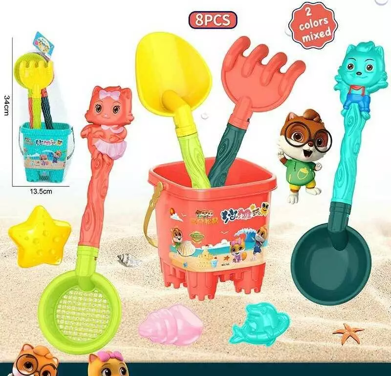 Пісочний набір 733-372 (72/2) 2 кольори, відро, 2 лопатки, сито, граблі, 3 формочки, в сітці
