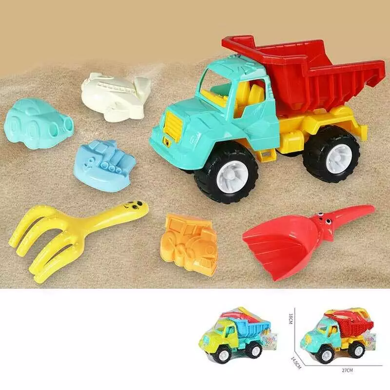 Пісочний набір KZ 6438 (36/2) 2 кольори, розмір самоскида - 27х14.5.х18 см, лопатка, граблі, 4 формочки, в сітці