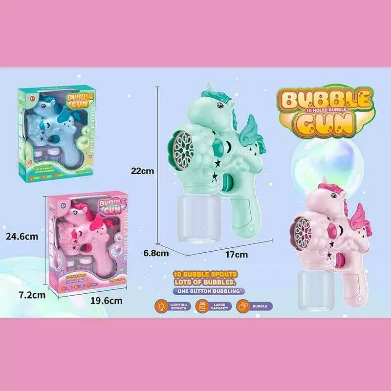 Пістолет з мильними бульбашками 504 (60) 2 кольори, “Єдиноріг”, автоматичний принцип, 2 пляшки з мильним розчином, на батарейках, підсвічування, в кор