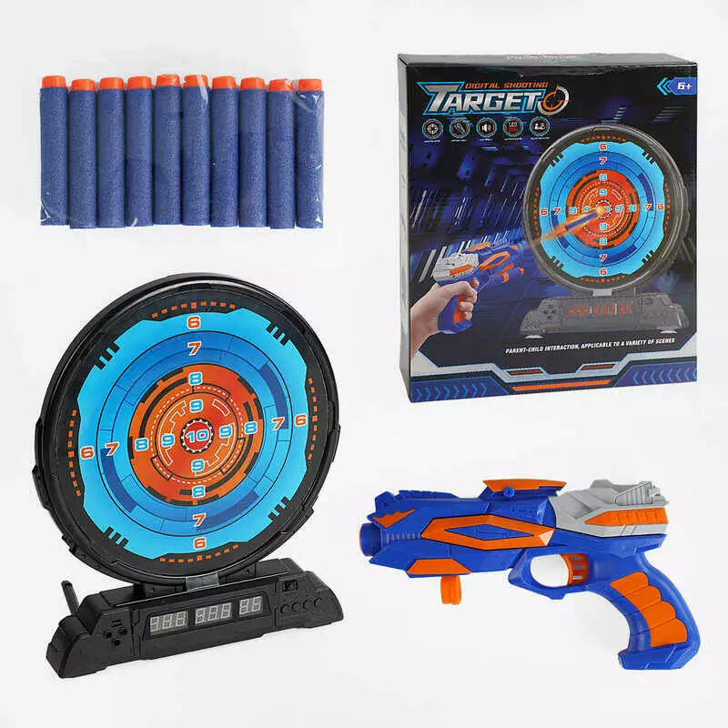 Пістолет з мішенню 3695 (8) підсвічування, озвучування англійською, 3 режими, 10 м`яких патронів, механічний пістолет, в коробці