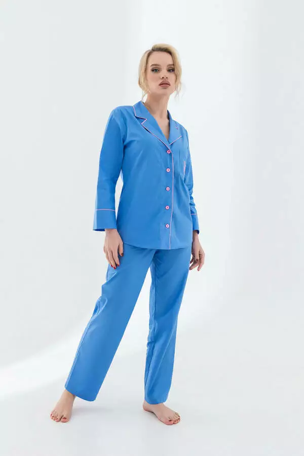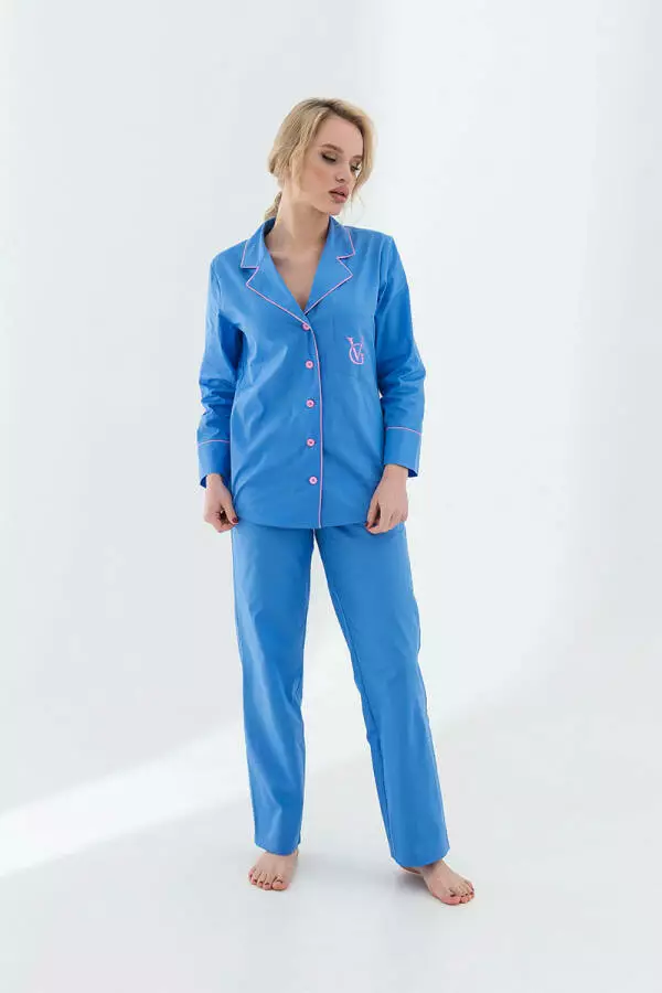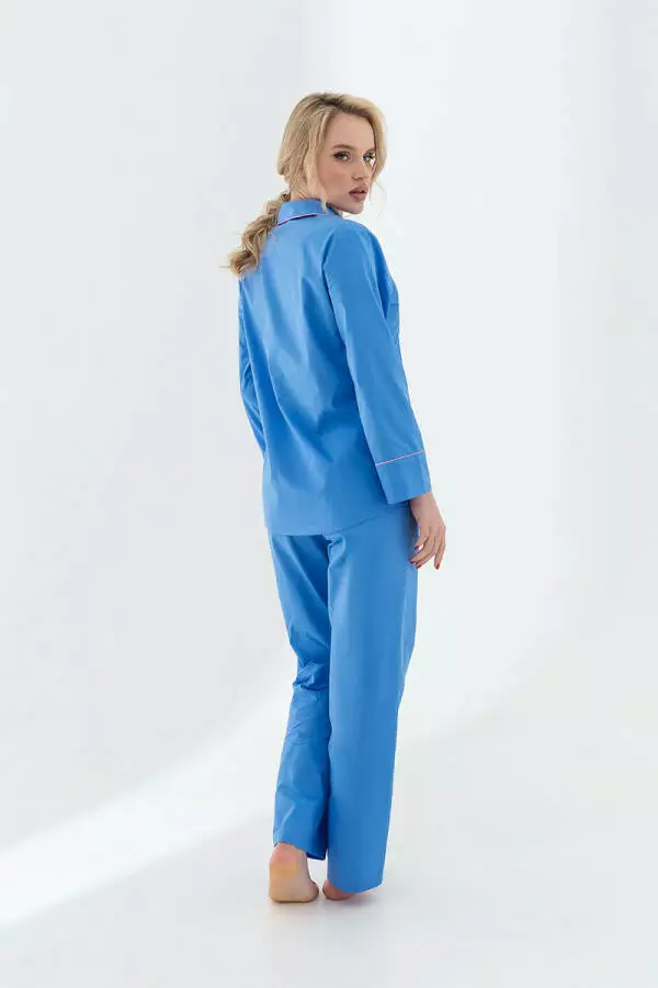 Кофта має класичний крій з витонченим коміром і застібкою на гудзики, що додає їй елегантності. Оздоблення контрастним кантом підкреслює витонченість дизайну і робить цю піжаму справжнім витвором мистецтва. Вільний крій штанів дозволяє відчувати себе невимушено і вільно, що особливо важливо для комфортного сну.