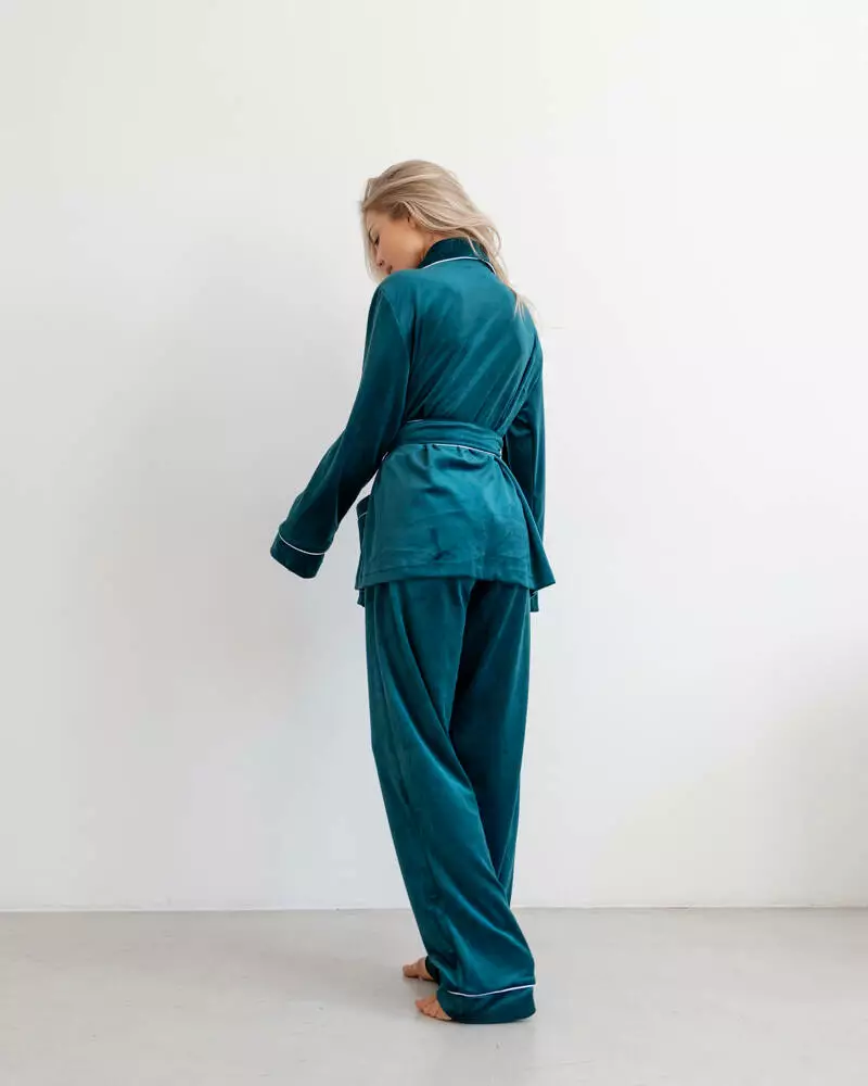 Жіноча піжама з велюрової тканини. Комплект складається з довгої сорочки з кишенею на грудях та штанів вільного крою на резинці. Жіночий костюм ідеально підходить для сну та домашніх справ. Тканина майже не мнеться, добре пропускає повітря і не втрачає колір при пранні. Увага, піжама розміру XL на замовлення: пошиття такої краси займе 2-3 дні