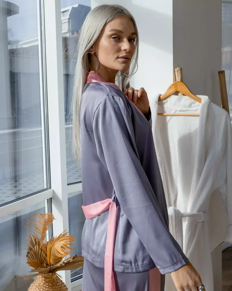 Ніжний шовковий піжамний костюм, який не хочеться знімати! Комплект: витончений мереживний топ, що регулюється, сорочка із поясом та вільні штани на резинці із лампасами. Модель оздоблена рожевим кантом, що ідеально поєднується із сірим кольором. Такий піжамний виріб чудово підходить для комфортного сну та занять домашніми справами. Тканина легка, повітряна, не подразнює шкіру та приємна до тіла.