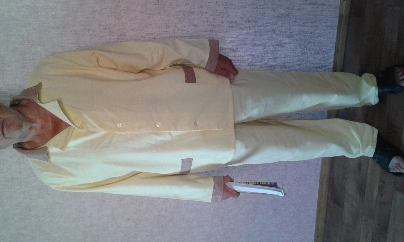 - бязевые ( пиджак на пуговицах, два накладных кармана, штаны на резинке классические) цвет бирюзовый