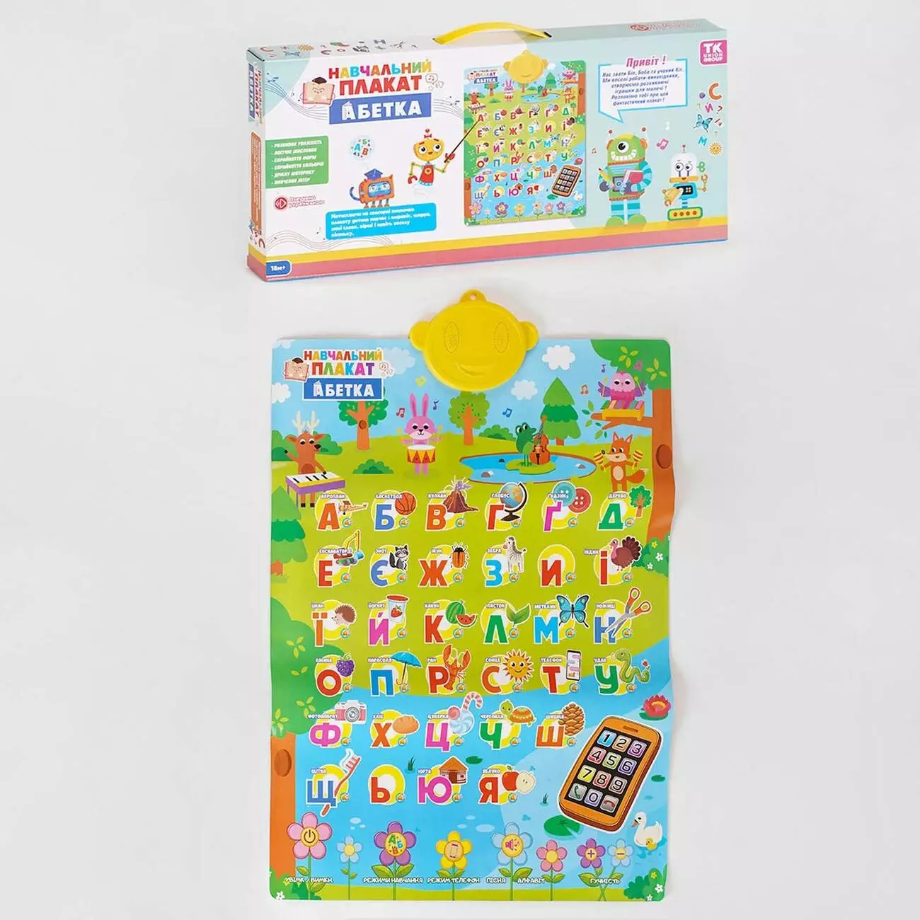 Один із найцікавіших та найефективніших форматів навчання малюка – формат гри. Навчальний плакат від “TK Group” стане незамінним придбанням у якості розвивальної іграшки для дитини. Веселі розробники Біл, Боба та вчений Кіт подбали про те, щоб свої перші важливі навички малюк отримав легко та невимушено. Особливості: - відповідає технічному регламенту безпеки іграшок; - розмір: 57х43 см; - працює від 3-х батарейок типу "ААА" (не входять до комплекту); - українське озвучування; - сенсорні кнопки; - кнопка увімкнення/вимкнення; - кнопки регулювання гучності; - режими: режим навчання (вивчаємо літери, вивчаємо слова, слухаємо вірші, іспит); режим телефону; режим відтворення пісень та алфавіту. Іграшка розвиває уважність, логічне мислення, тренує дрібну моторику. Малюк навчиться сприйняттю нових форм, кольорів та звуків, вивчить український алфавіт та розучить кумедні вірші.
