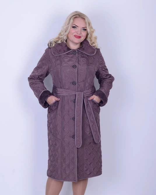 Демисезонный женский плащ. Стеганный снаружи, внутри имеет текстуру короткого меха. Крой ровный, капюшон отстегивается, воротник отложной.Два накладных кармана с кисточка. Застежка - пуговицы. Пояс в комплекте. Длина изделия 95 см. Размерный ряд модели - 50-60.