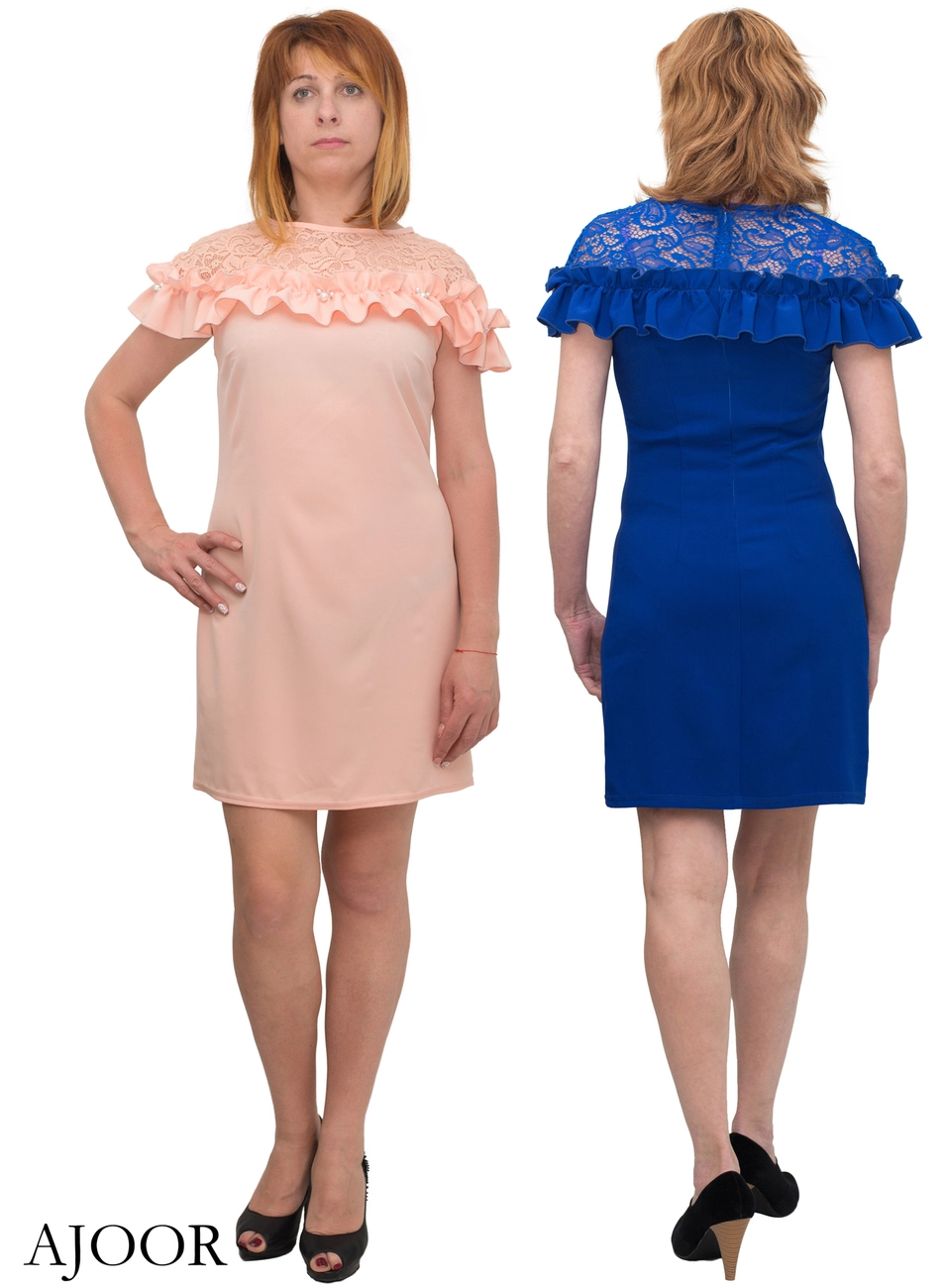 Платье выполнено из крепа,кокетка из гипюра.Платье дополнено оборкой,на которой пришиты бусины.Разм 42-44-46
