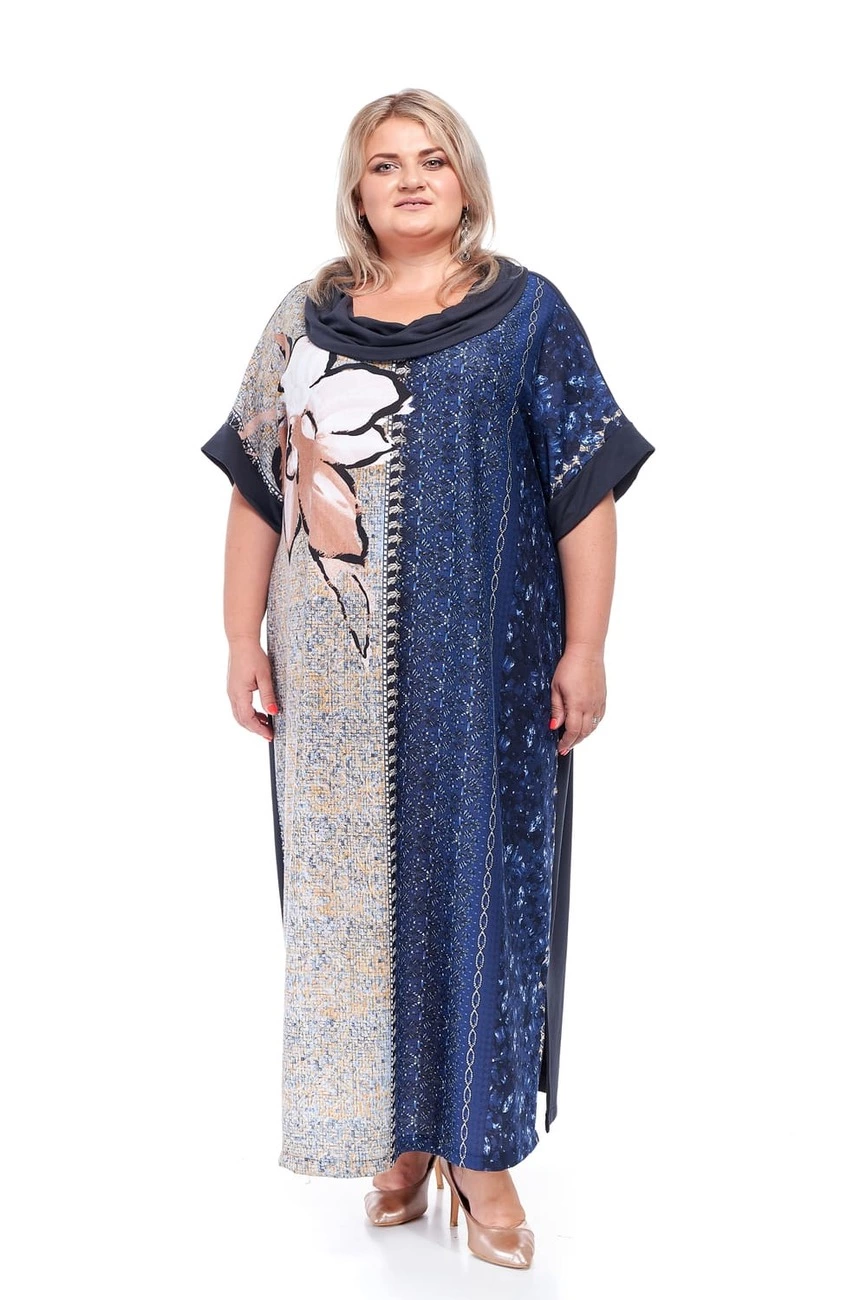 Тканина: французький трикотаж - 77% поліестер, 18% віскоза, 5% спандекс. Стильна сукня в підлогу вільного силуету. Рукав до ліктя – широкий. Горловина кругла – хомутом. Лицьова частина візуально складається з двох частин, спинка однотонна.