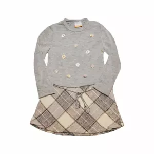 Оригинальный дизайн платья будет выгодным акцентом в его образе: серый верх-кофточка с мелким нежным принтом комбинируется с клетчатой юбочкой свободного кроя.