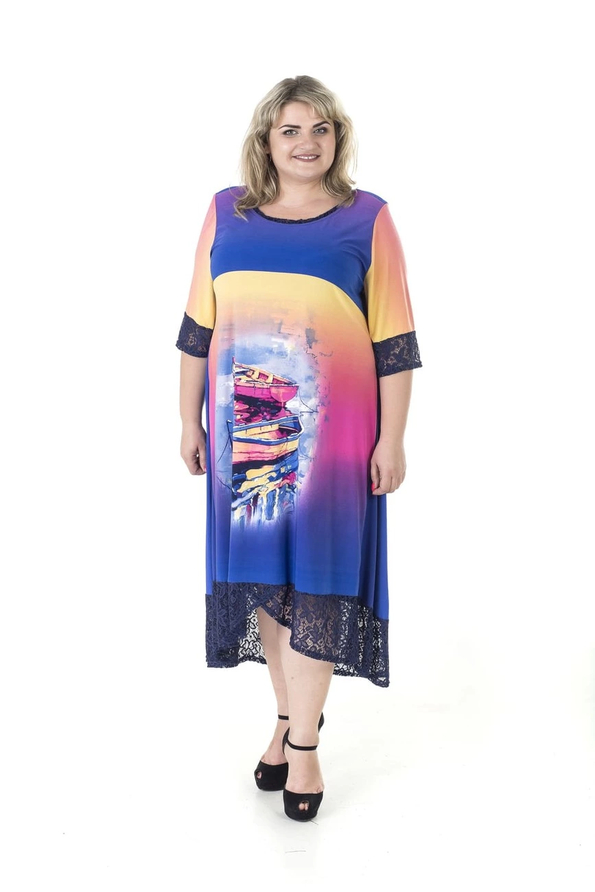 Тканина: масло-70% поліестер; 20% віскоза; 10% еластан. Стильна сукня з яскравим принтом, напівприлеглого силуету. Рукав до ліктя з мереживом. Горловина кругла з мереживом. Низ виробу також прикрашений мереживом. Спинка однотонна. Розміри: 62-64 ог-128 от-136 об-160 дв.пер-99 ди.сп-120 шр-41 др-38; 66-68 ог-136 от-144 об-168 дв.пер-99 ди.сп-120 шр-43 др-38