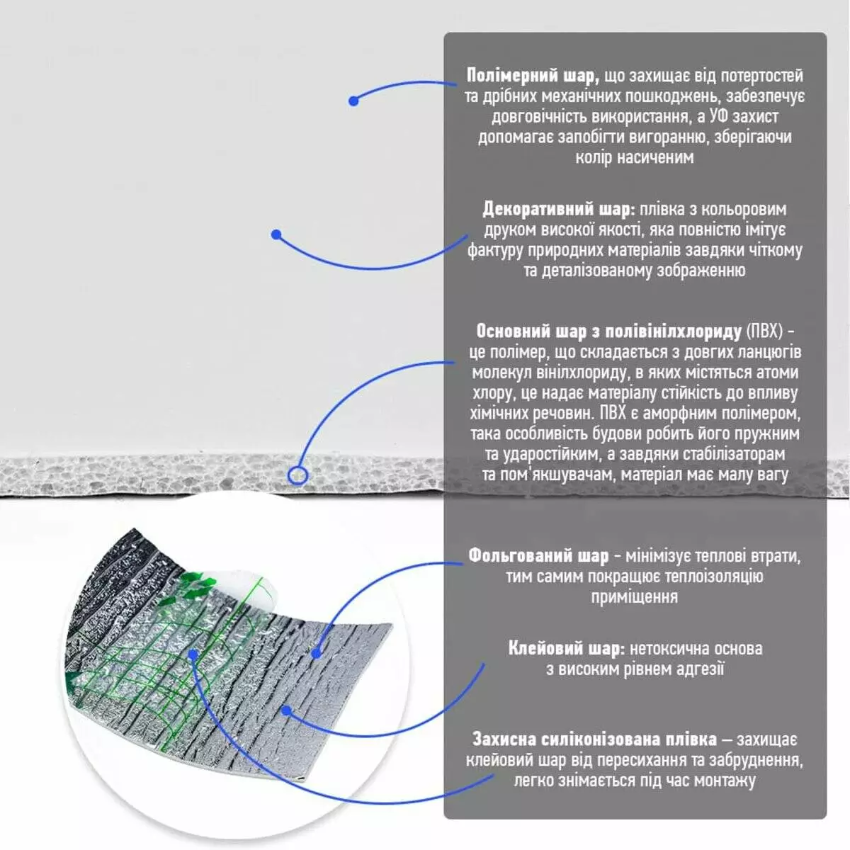 4. Фольгований шар: основна властивість цього шару – відображення теплових хвиль, що дозволяє мінімізувати теплові втрати, тим самим покращити теплоізоляцію приміщення.