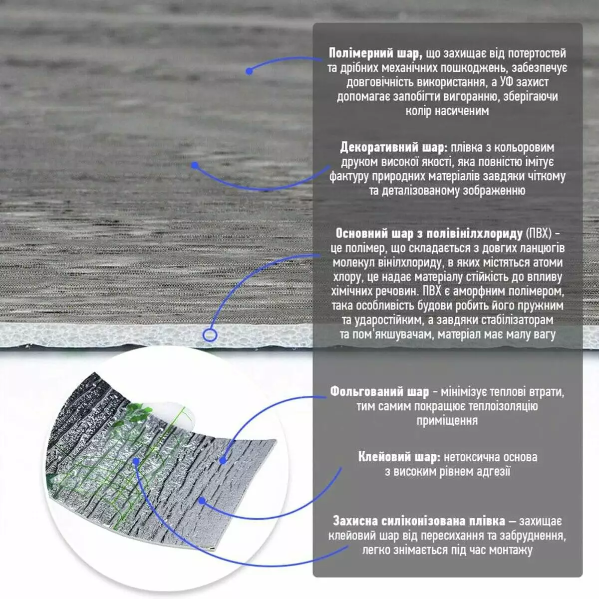 - Полімерний шар, що захищає від потертостей та дрібних