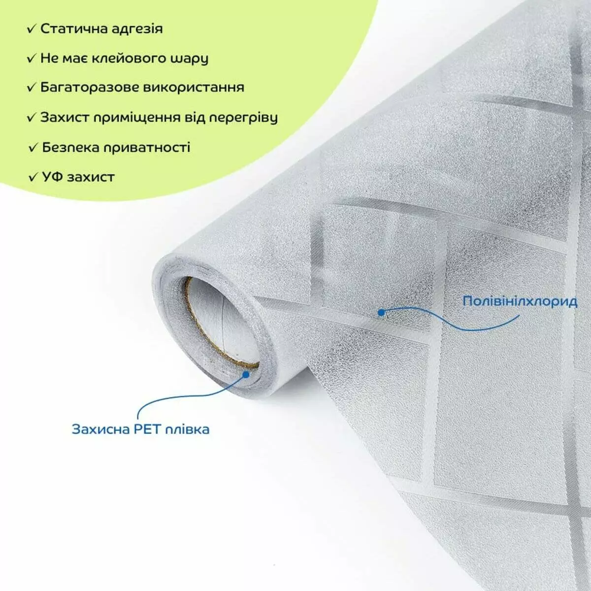 • Універсальність та легкість в монтажі: ПВХ плівки можна легко різати ножицями або монтажним ножем, що дозволяє використовувати їх у різних місцях: на вікнах, розсувних дверях, кухонних шафах та інших скляних поверхнях.