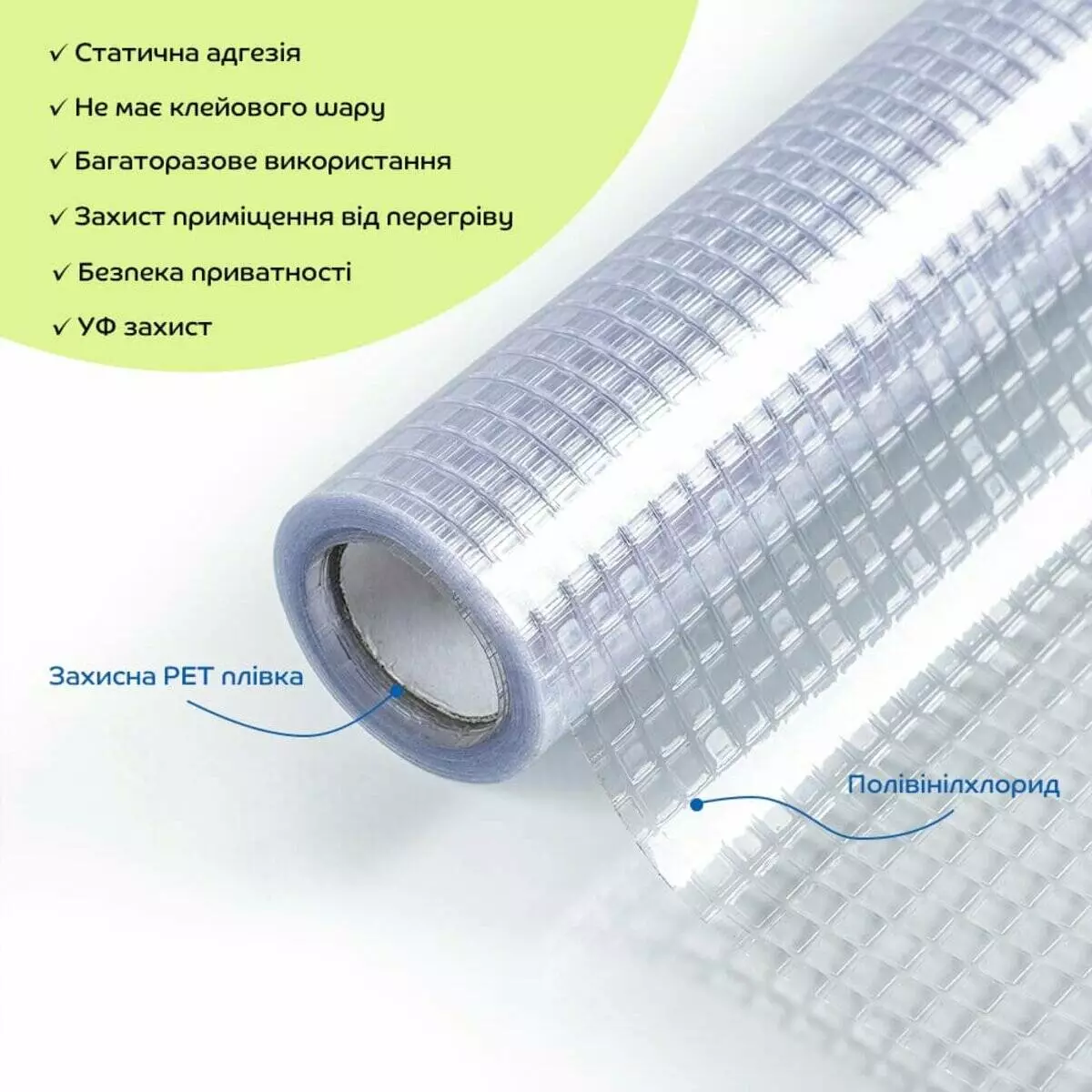 • Універсальність та легкість в монтажі: ПВХ плівки можна легко різати ножицями або монтажним ножем, що дозволяє використовувати їх у різних місцях: на вікнах, розсувних дверях, кухонних шафах та інших скляних поверхнях.