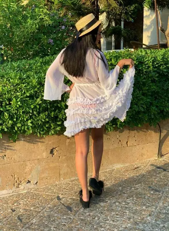 Шифоновий пляжний халат з оборками по юбці, рукав 3-4 флангом, таліч на кулісці
