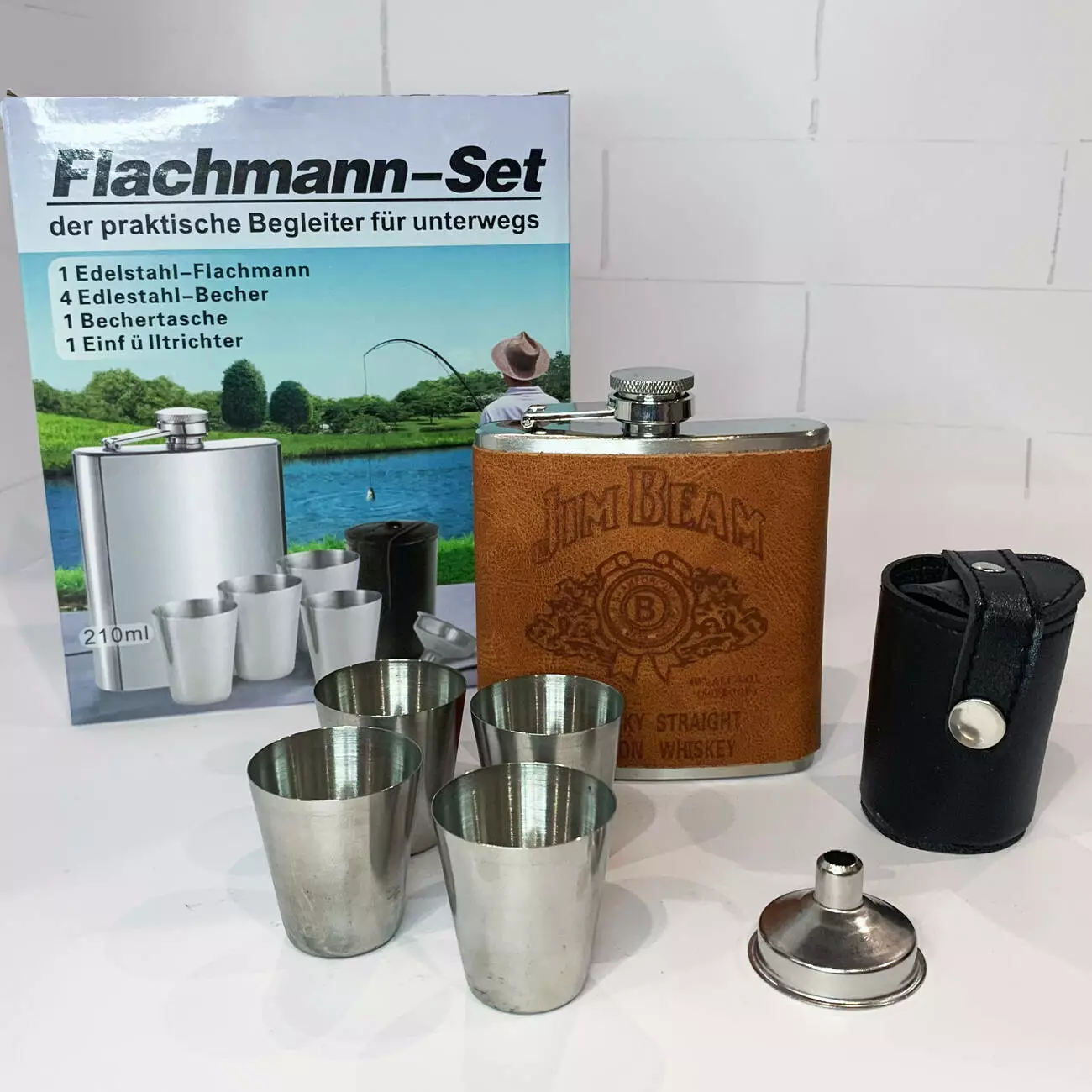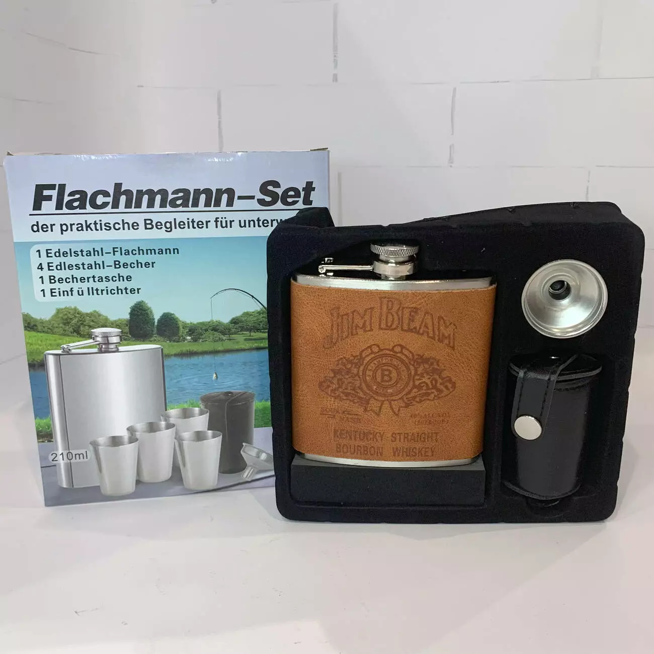 Универсальный и стильный набор для тех, кто ценит практичность и атмосферу отдыха на природе или в дороге. В комплект входит металлическая фляга объёмом 210 мл с обложкой из экокожи с тиснением Jim Beam Kentucky Straight Bourbon Whiskey, 4 рюмки из нержавеющей стали, удобная воронка для наливания и футляр для хранения рюмок. Всё упаковано в подарочную коробку.