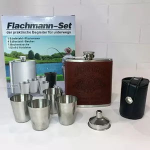 Универсальный и стильный набор для тех, кто ценит практичность и атмосферу отдыха на природе или в дороге. В комплект входит металлическая фляга объёмом 210 мл с обложкой из экокожи с тиснением Jim Beam Kentucky Straight Bourbon Whiskey, 4 рюмки из нержавеющей стали, удобная воронка для наливания и футляр для хранения рюмок. Всё упаковано в подарочную коробку.
