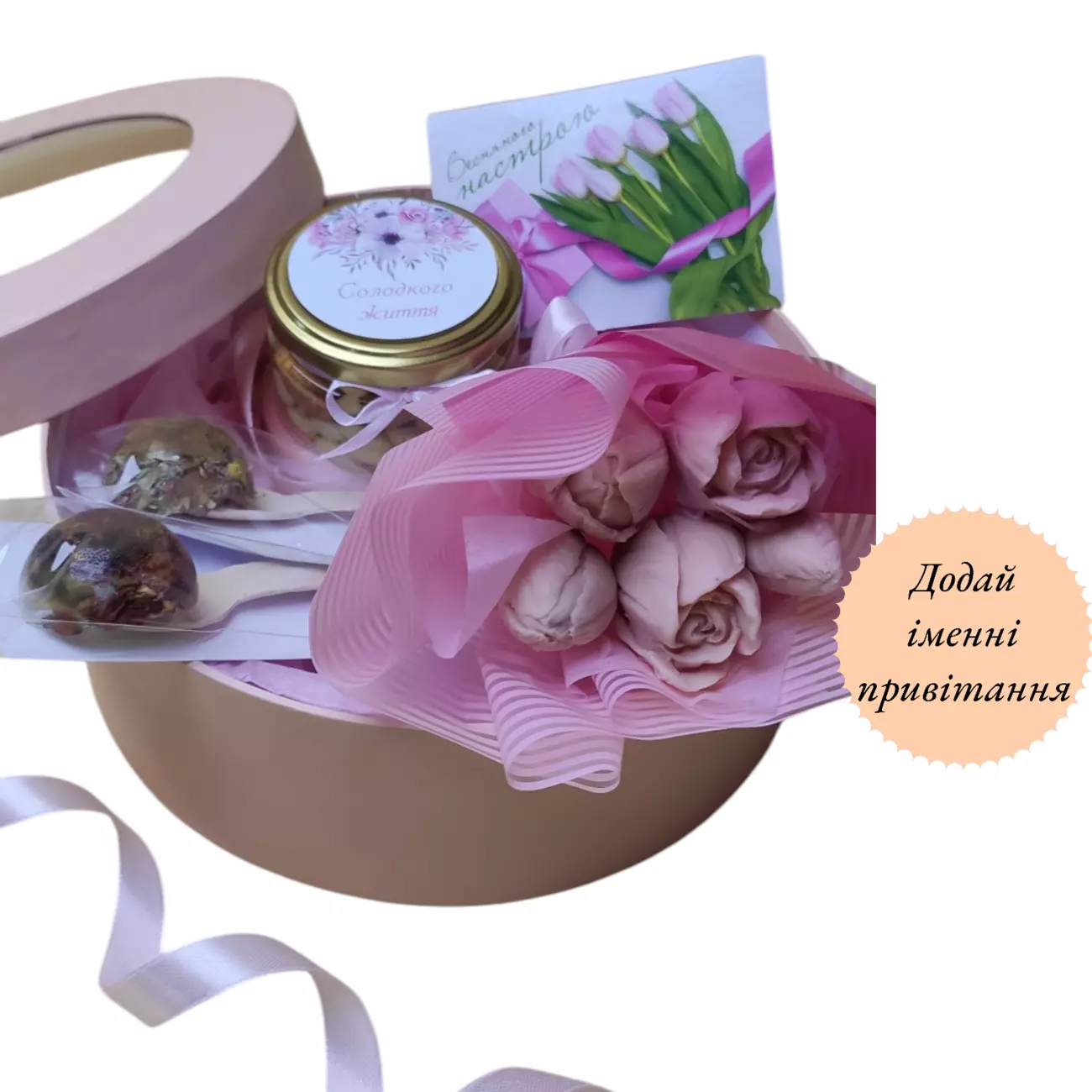 Подаруйте тепло та радість у цей весняний день! Наш ексклюзивний набір створений, щоб подарувати незабутні емоції. Вишукане поєднання натуральних солодощів та ароматного чаю ідеально підійде для мами, сестри, колеги чи коханої.