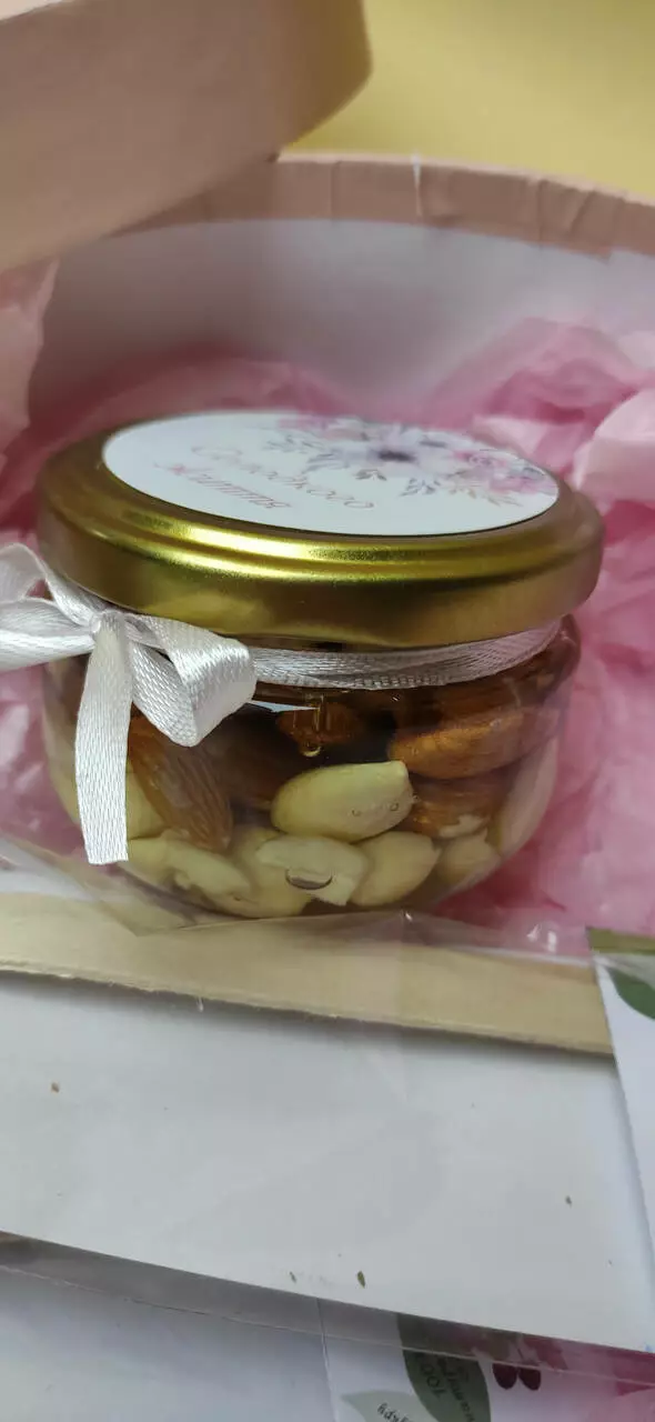 Асорті хрустких горішків з медом – мигдаль, фундук, кеш’ю, волоський горіх та арахіс у ніжному ароматному меді.