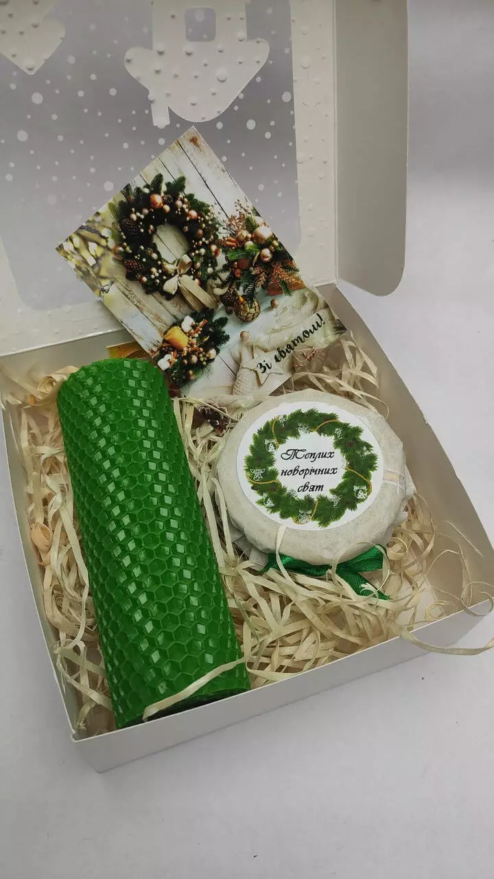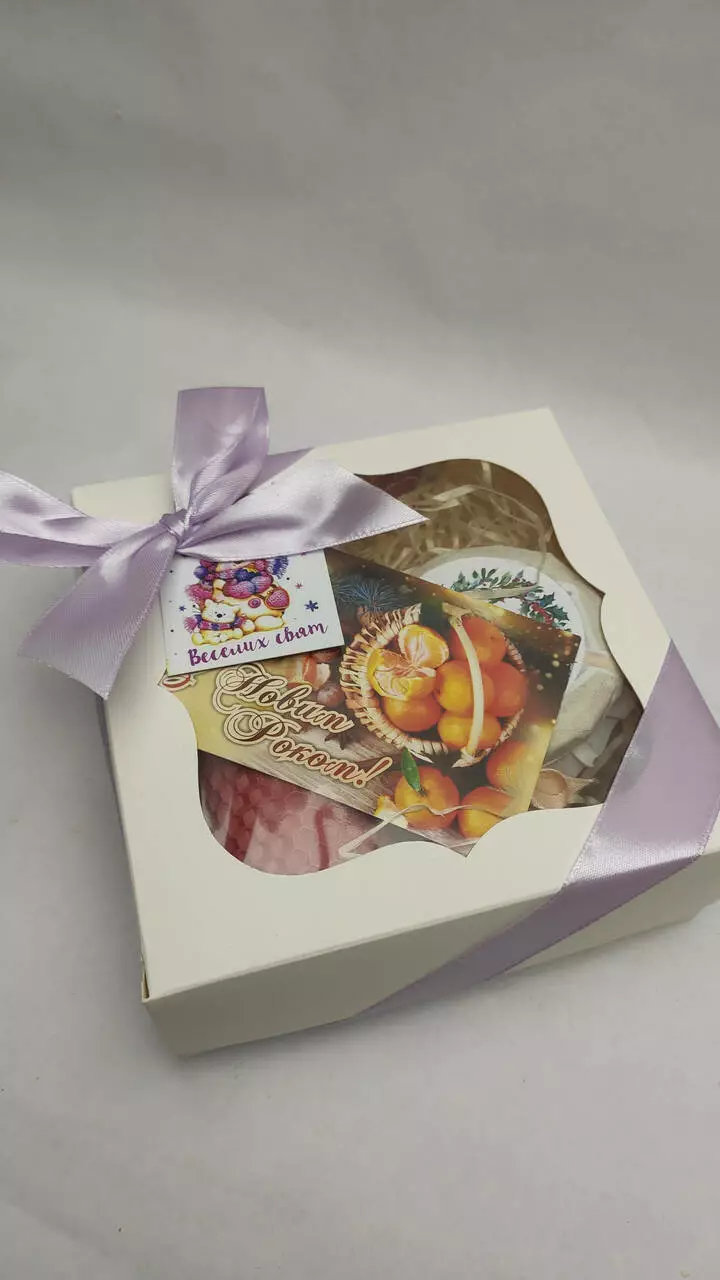 Набір доповнений вітальною листівкою та прикрашений стрічкою та біркою. Напис на баночці може бути будь-яким за вашим бажанням, будь-якою мовою. Також можливе розміщення логотипу компанії.