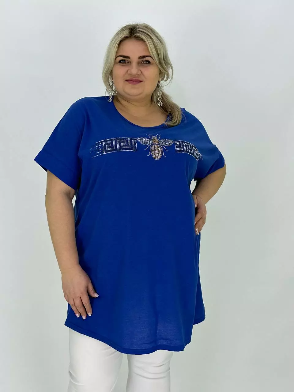 Подовжена футболка з турецького трикотажу супрем з гарною розтяжністю, прикрашена якісною камінною накаткою.