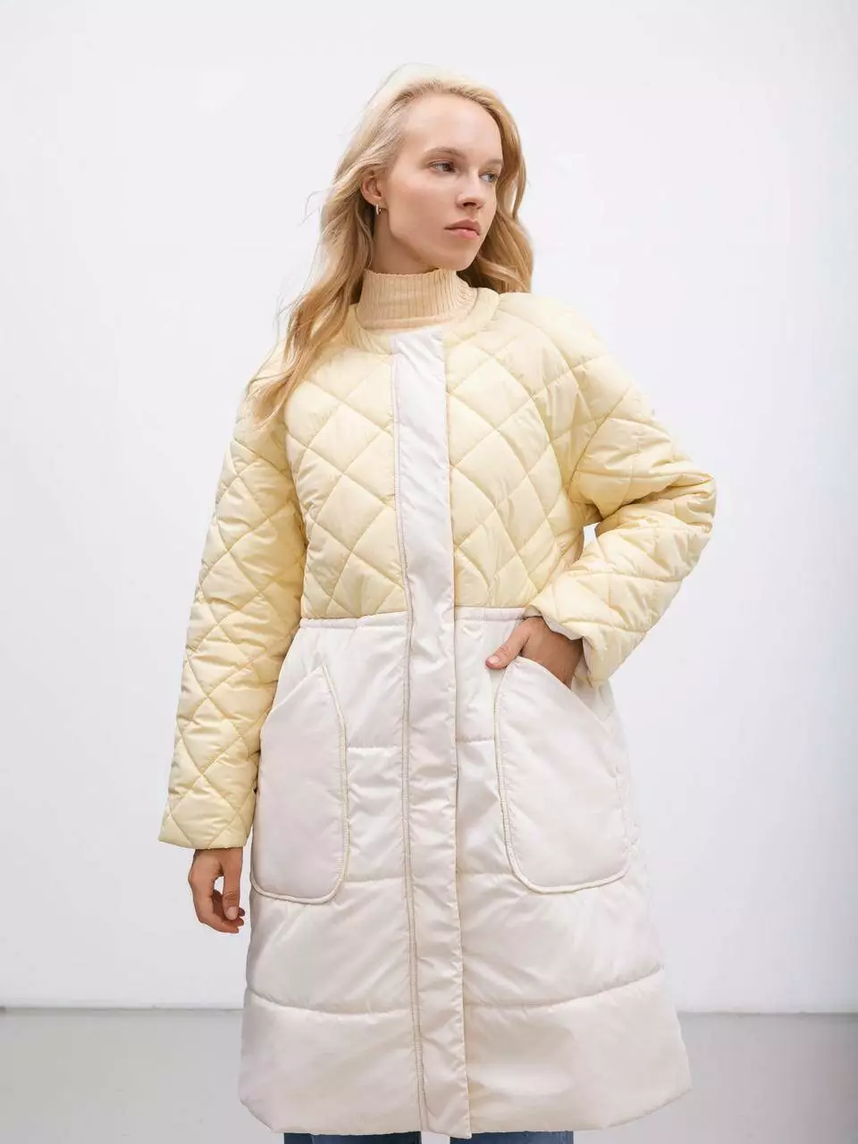 Ця подовжена утеплена куртка-пальто об'єднує в собі елегантність і практичність, створюючи унікальний образ для холодної пори року. Виготовлена з двох видів тканин, вона привертає увагу своїм дизайном: верхня частина жовта стьобана, а нижня частина кремового кольору, що додає особливого шарму.