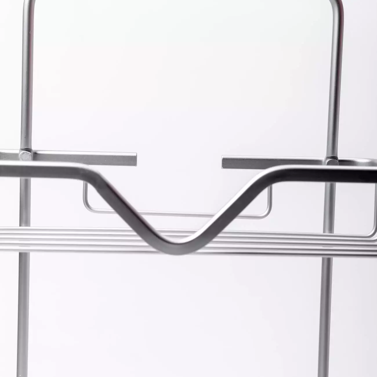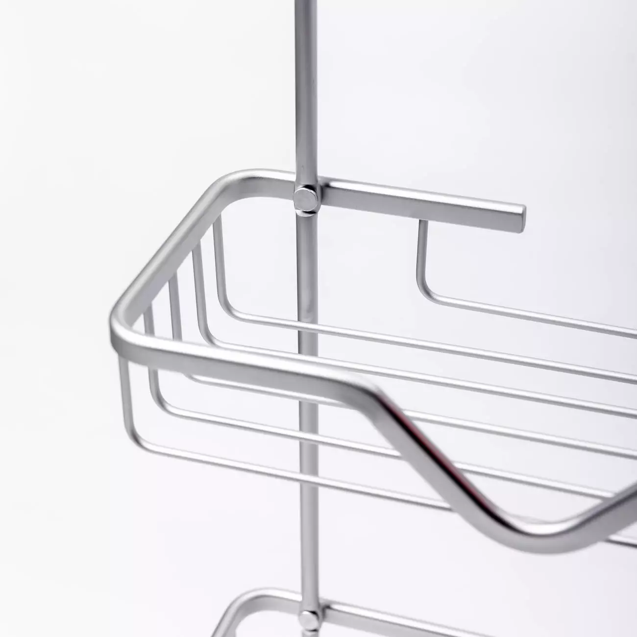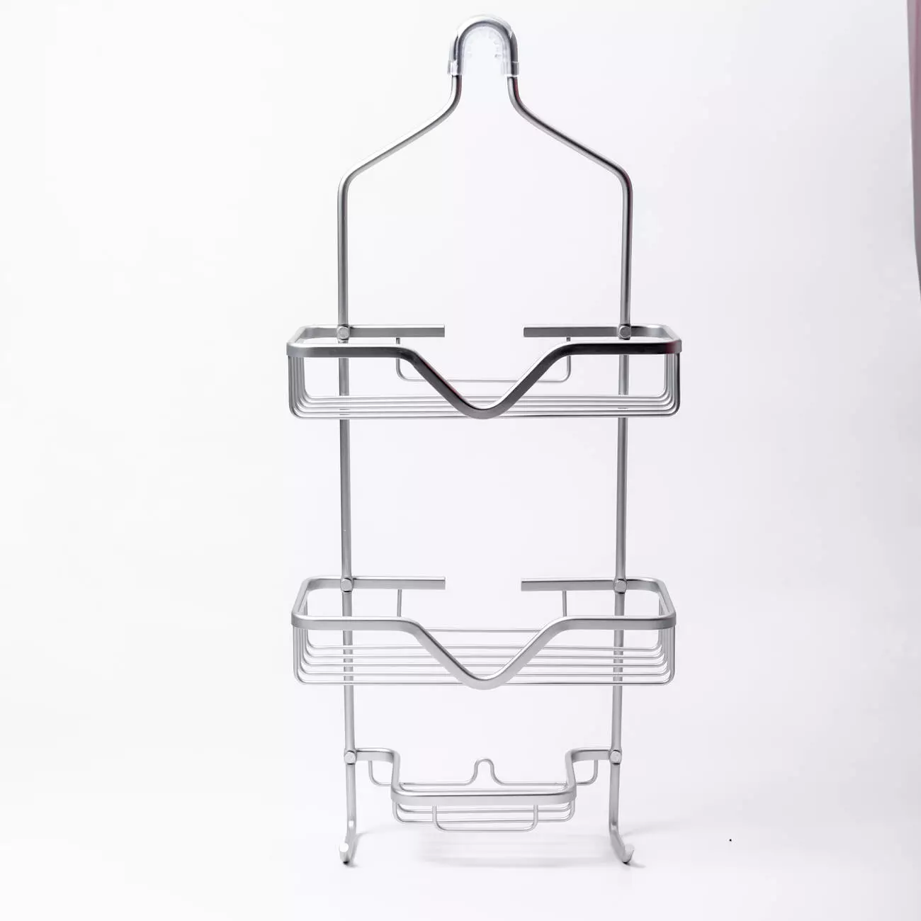 Практична та стильна полиця для ванної кімнати з двома глибокими кошиками та нижнім відділенням для мила та аксесуарів. Конструкція із сталі з гальванічним покриттям витримує підвищену вологість, а спеціальний гачок дозволяє повісити полицю у будь-якому зручному місці ванної кімнати. Зручні борти перешкоджають випаданню флаконів, а відкрита решітка забезпечуює стікання води та швидке висихання.