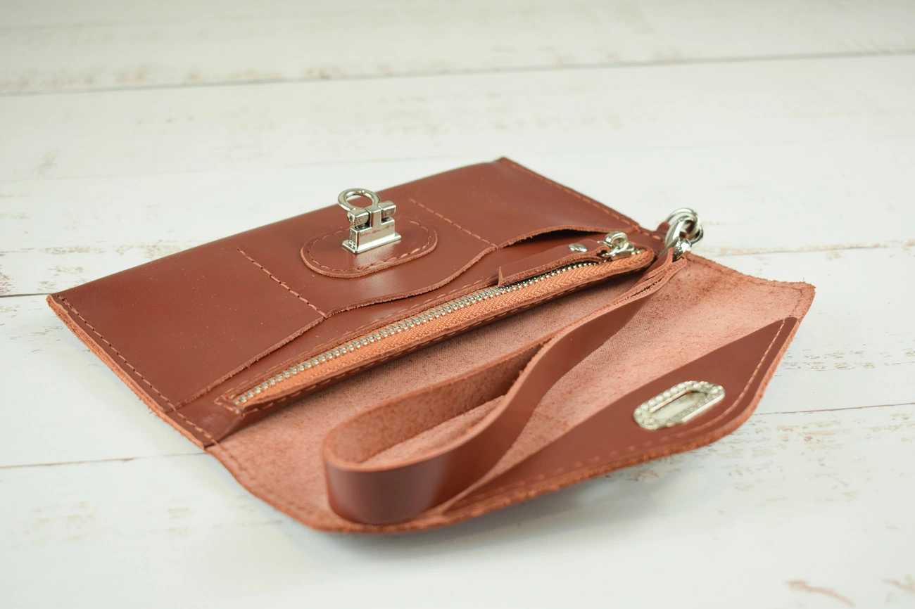 Коли Ви тримаєте в руках це портмоне, завдяки оригінальному замочку воно нагадує невеликий клатч. Всередині є 1 відділення для купюр, 1 відділення на металевій блискавці для монет, 3 кармна для карток. Портмоне можемо виготовити з ручкою в руку та плечевим ременем. Розмір 20х11,5х0,8 см