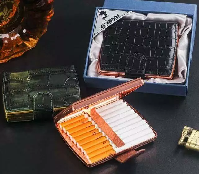 Стильный и практичный портсигар для настоящих ценителей. Корпус выполнен из прочного металла с декоративной обложкой, имитирующей кожу крокодила, в насыщенном зелёном цвете с глянцевым эффектом. Золотистые металлические элементы придают аксессуару роскошный вид. Удобная застёжка надёжно фиксирует крышку.
