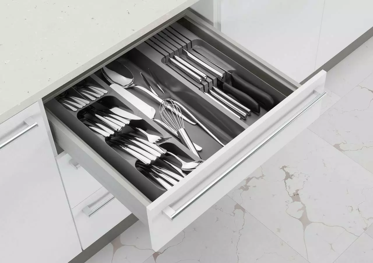 Потрійний лоток для столових приборів 38x39x5,5 см, сірий Emhouse EP-902 - це функціональне та стильне рішення для зберігання столових приборів на будь-якій кухні.