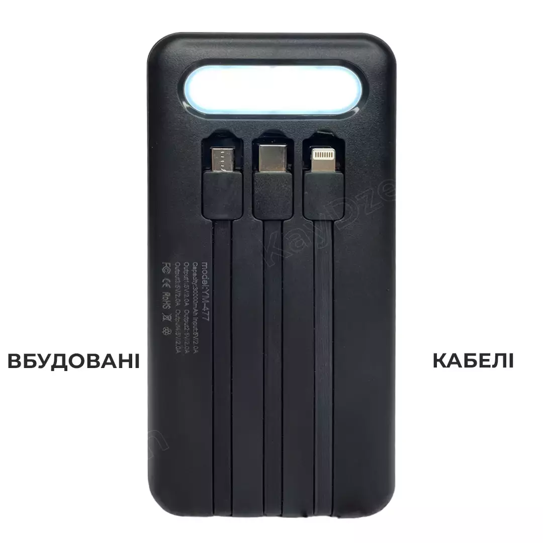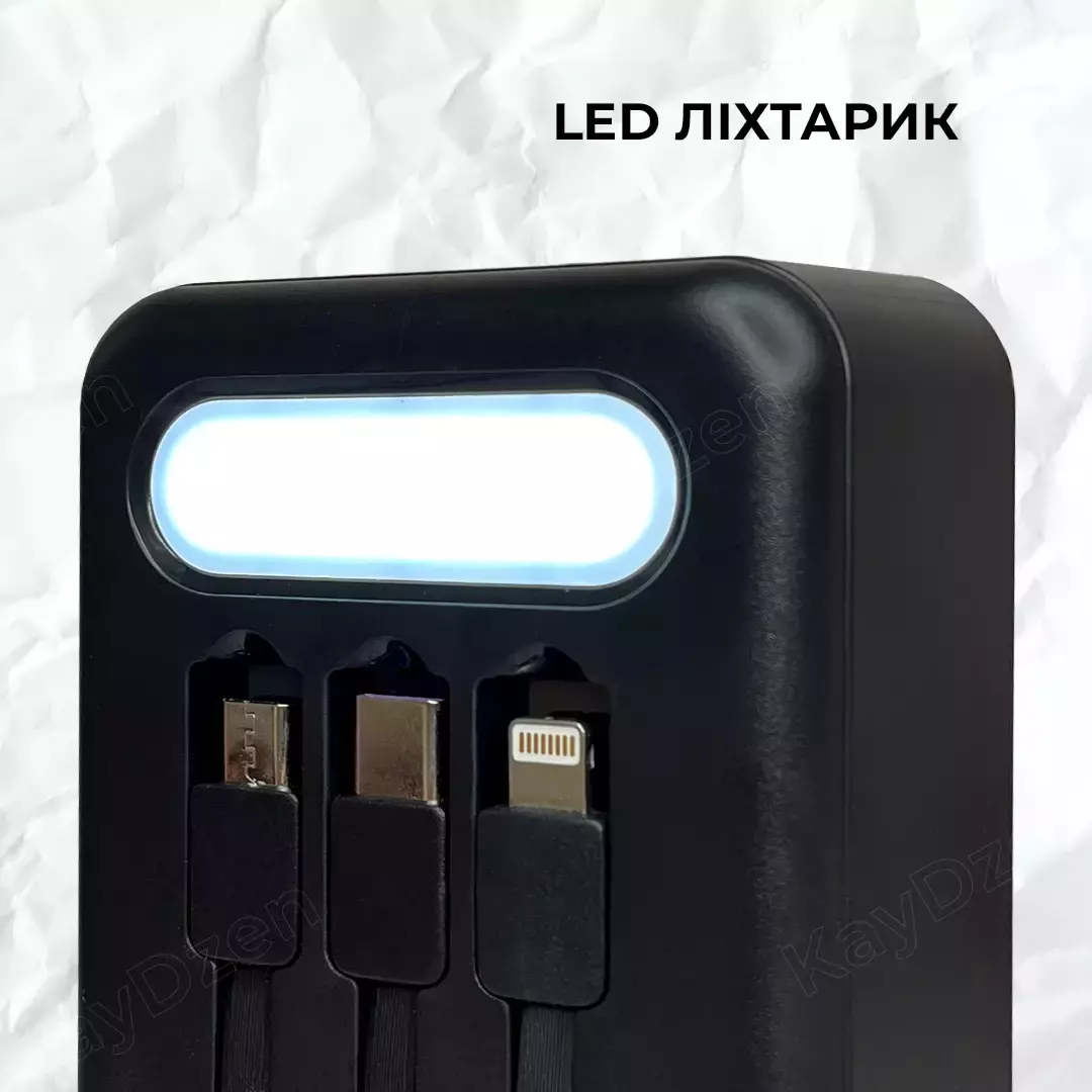 оборудован встроенными кабелями microUSB, USB Type C, USB Type A, и