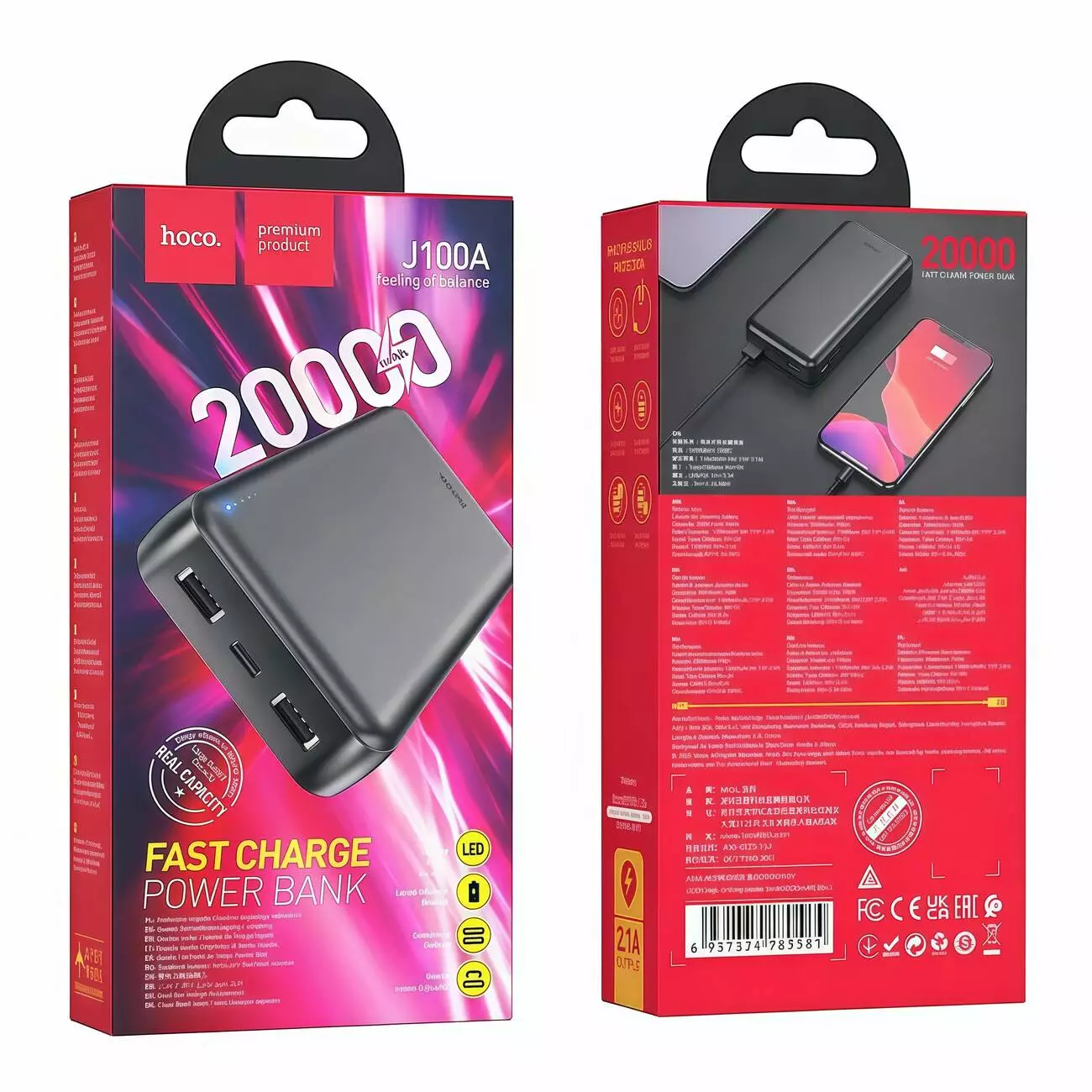 Power Bank Hoco J100A 2USB+Type-C (20000mAh) - компактна універсальна батарея, яка дозволить швидко та безпечно зарядити будь-який із ваших гаджетів. Зовнішній літій-полімерний акумулятор має ємність 20000 mAh. Обладнаний двома вихідними роз'ємами USB для підзарядки ваших гаджетів та по одному вхідному роз'єму Type-C та microUSB (для підзарядки самої батареї). Корпус батареї виготовлений із вогнестійкого пластику, що значно подовжує термін експлуатації пристрою. На лицьовій стороні корпусу є LED-індікатор заряда батареї. Активується кнопкою на бічній панелі.