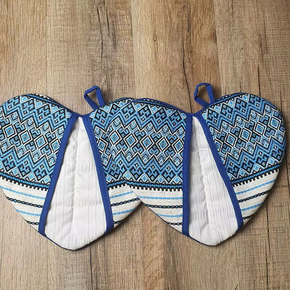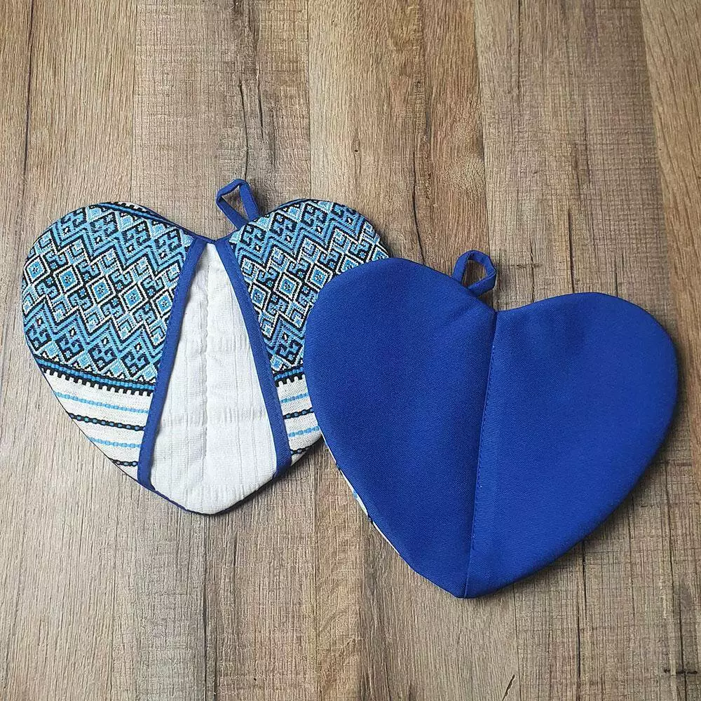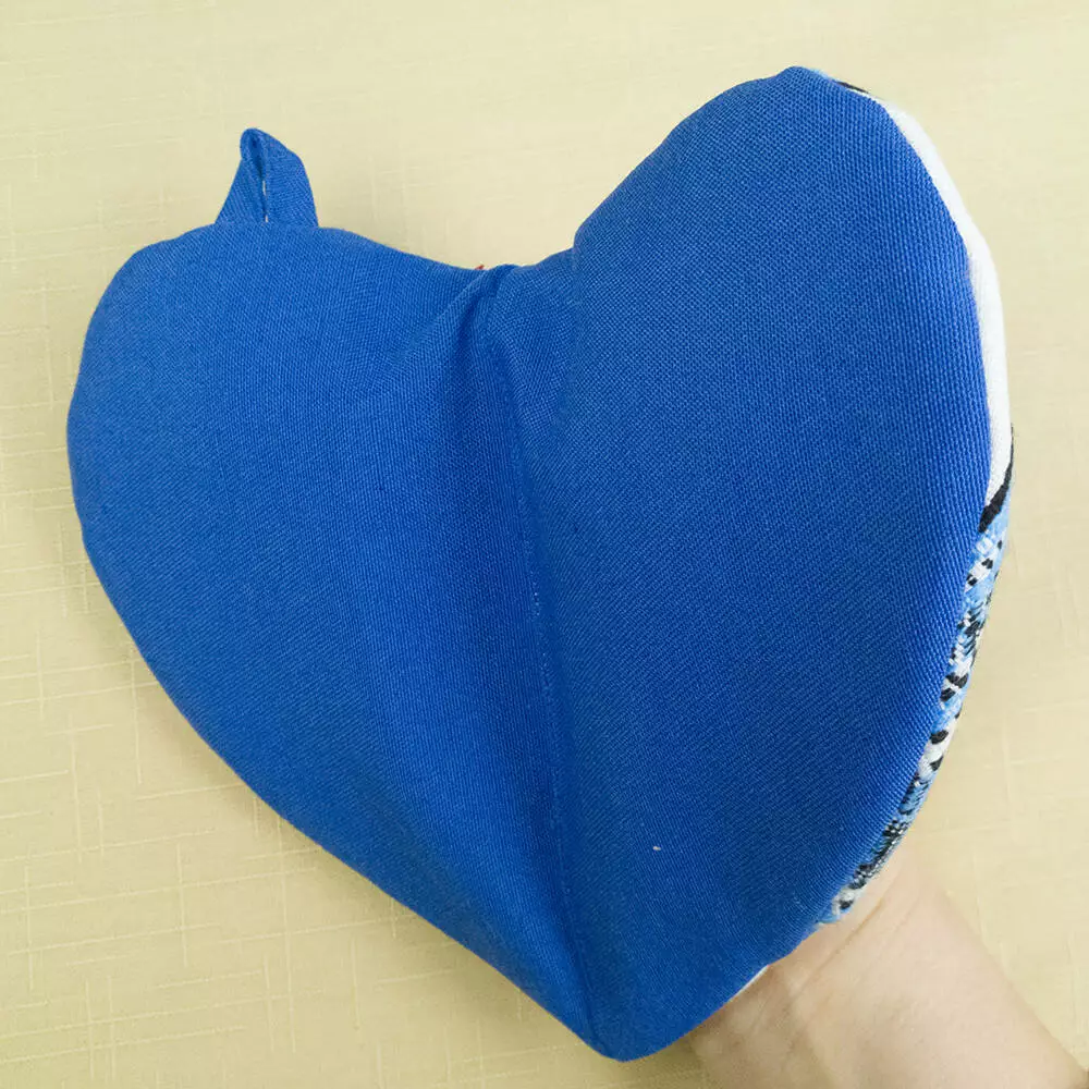 Сердцеобразная прихватка с синим орнаментом. Приятная на ощупь, с мягким наполнителем. Легко складывается пополам благодаря центральной строчке. Без проблем выдержит многочисленные стирки. Не такая ли прихватка нужна на кухне? Да и вдобавок имеет яркую петельку, а значит не составит труда найти ее в нужный момент на привычном крючке.