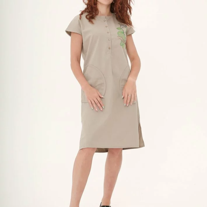 виконана з бежевого льону. Попереду по грудях планка з гудзиками,