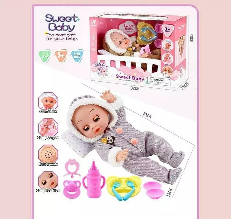 Пупс WD 2326 AB (36/2) 2 види, висота 27 см, звукові ефекти, сміх та плач, п’є, ходить на горщик, заплющує очі, посуд, пляшечка, подушка, в коробці