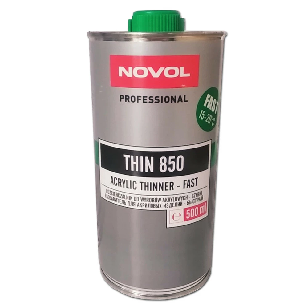 Растворитель акриловый Thin 850 (БЫСТРЫЙ) – это смесь органических разбавителей, предназначенных для разбавления всех грунтов и акриловых лаков. Растворитель Fast Novol Thin 850 рекомендуется для небольших объемов работ. Его можно использовать при покраске большой поверхности, при условии, что температура воздуха в рабочей зоне не превышает +20°С.