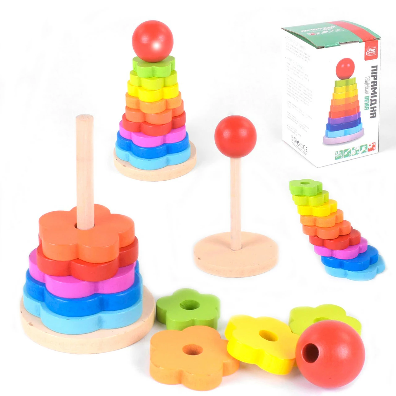 Деревянная игра от торговой марки Kimi Пирамидка представляет собой 7 разноцветных деревянных колец в форме цветов. Они нанизаны на деревянное основание со штырьком, а верхушка выполнена в виде небольшого шарика. Пирамидка Kimi познакомит малыша с множеством цветов и понятными формами. Ребенок с интересом будет снимать, надевать и накладывать друг на друга колечки ориентируюсь на разницу в размере колец.