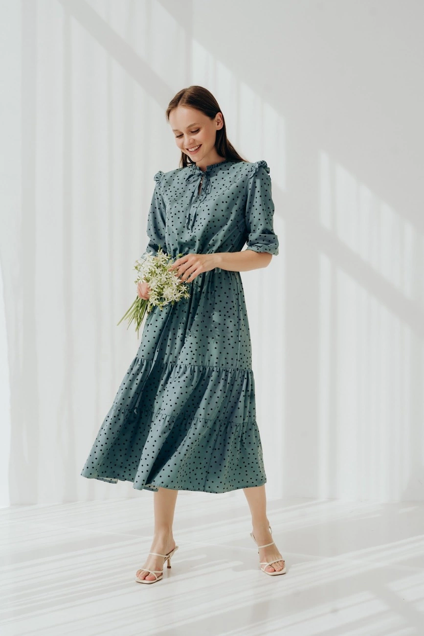 зав’язі, міді довжина, легкі волани внизу сукні та вільний фасон.